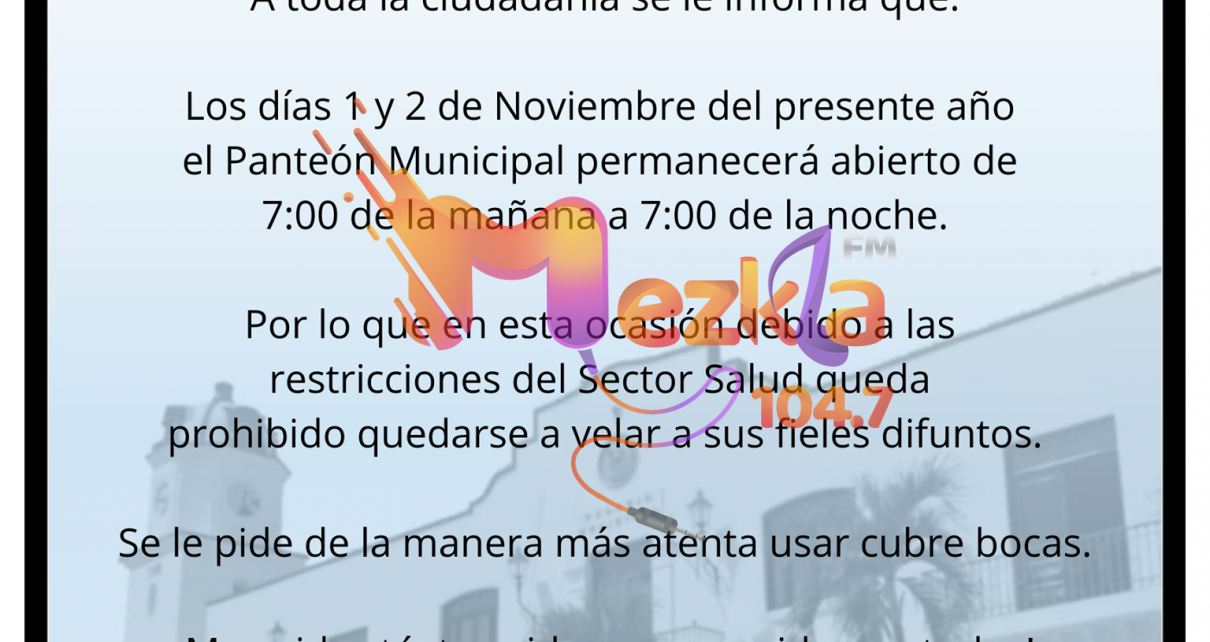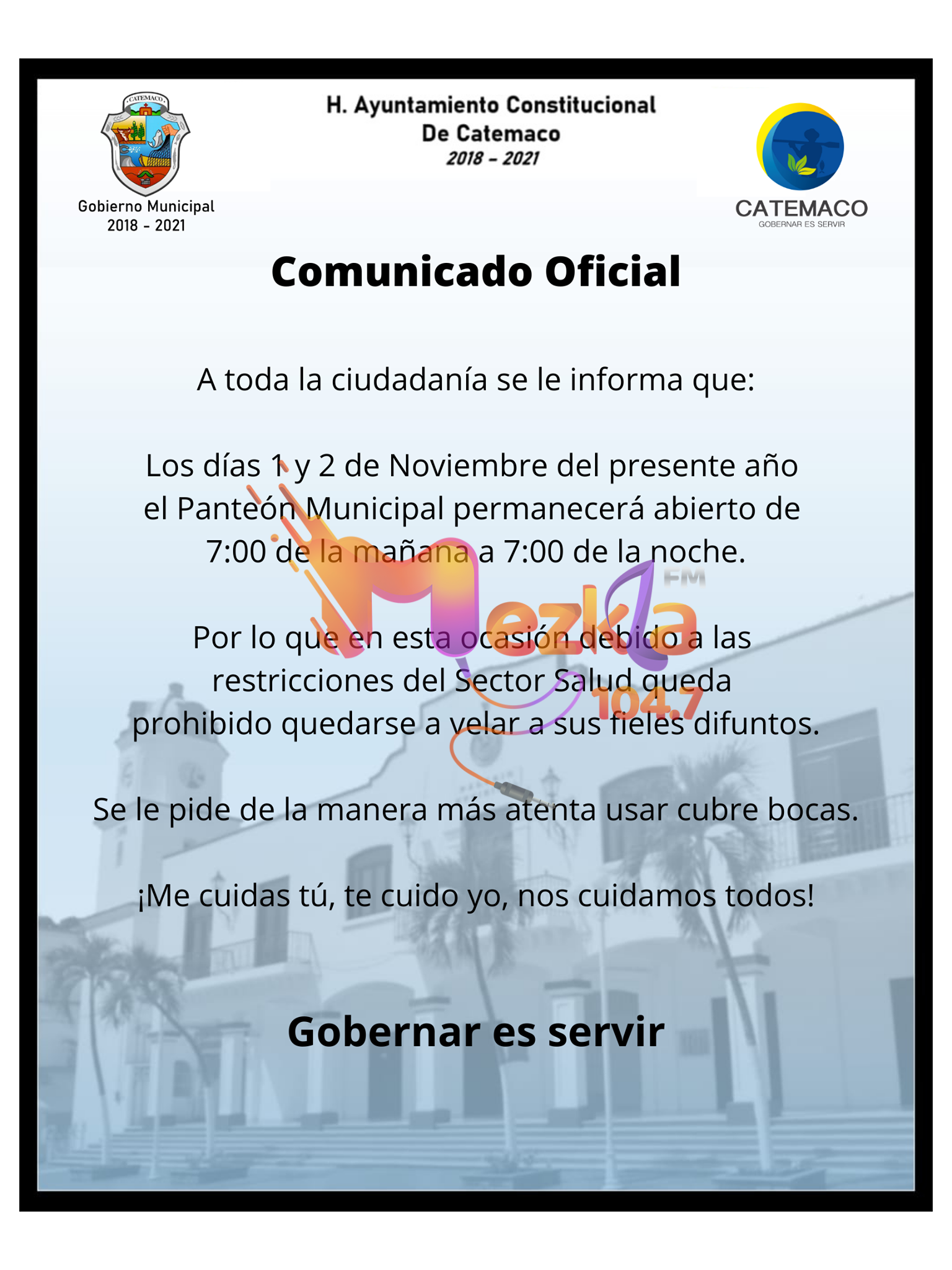Para que la ciudadanía se enteré de las modificaciones que se realizarán para la celebración del Día de Muertos en el municipio catemaqueño, la administración que encabeza Julio Ortega informa: