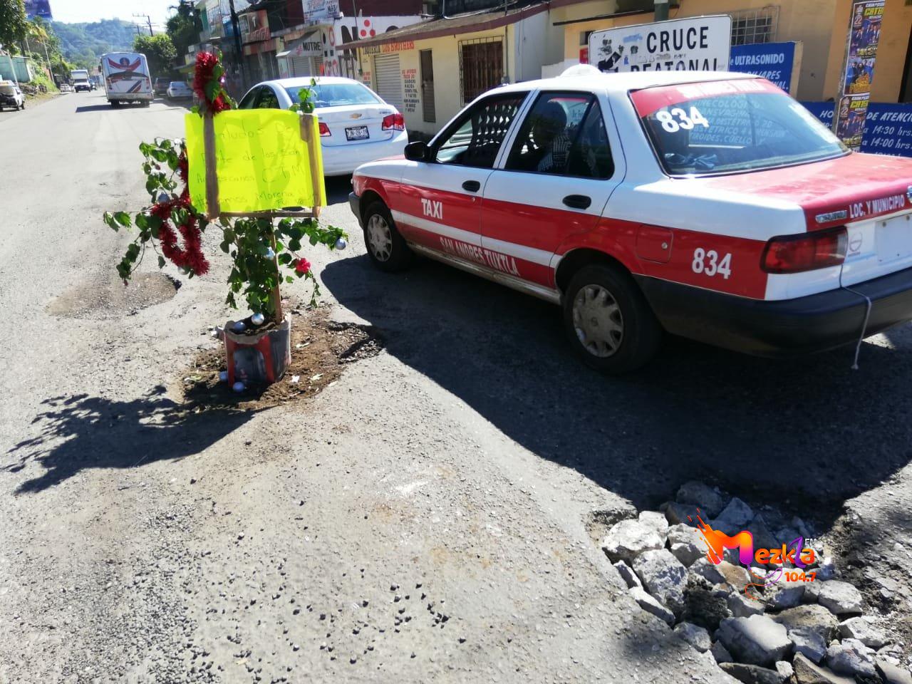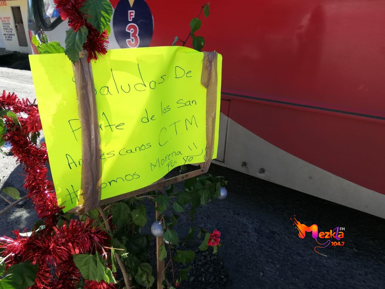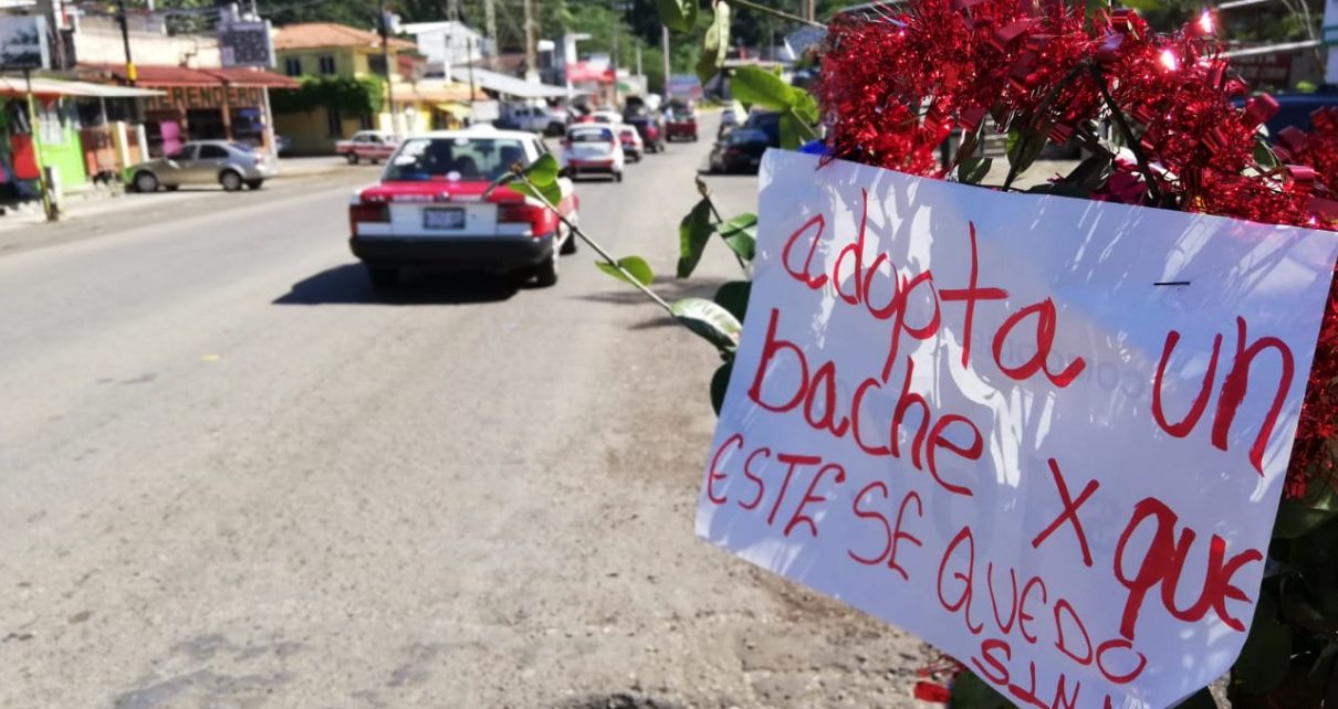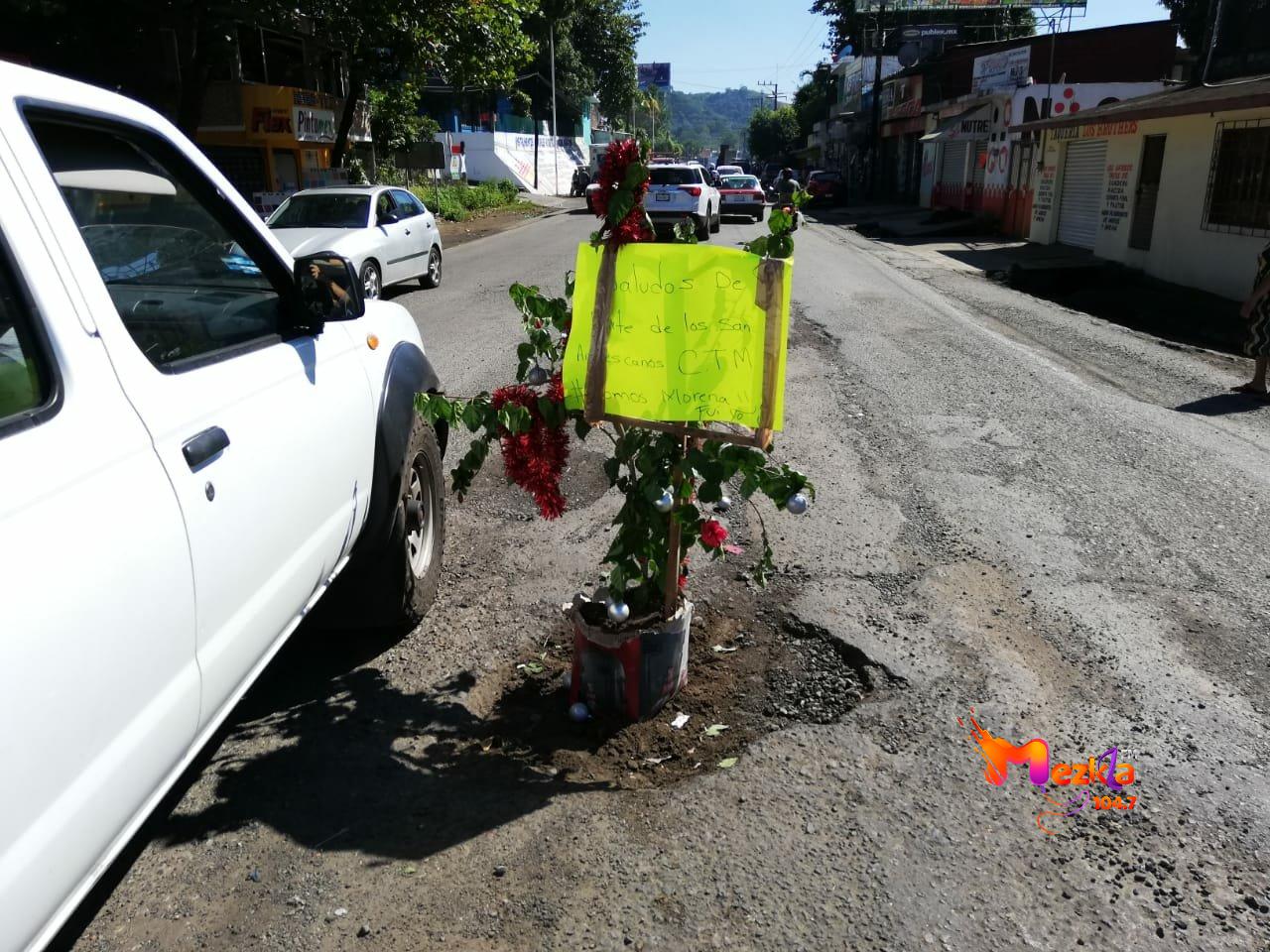 Luis Manuel Toto Polito/ San Andrés Tuxtla, Ver.- Aprovechando los enormes baches que existen en la carretera federal 180 en San Andrés Tuxtla, ciudadanos han optado por la iniciativa de la siembra de árboles de Navidad dejando mensajes como “adopta un bache porque este de quedó sin madre”.
