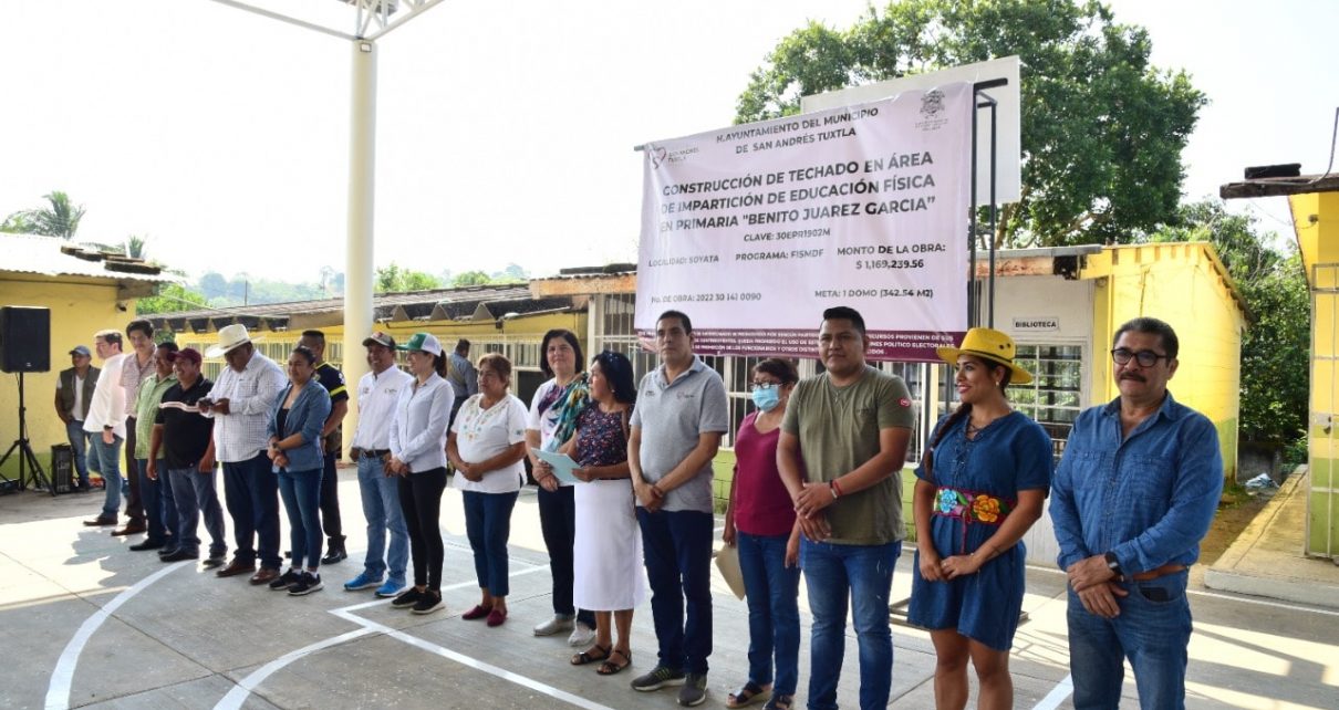 San Andrés Tuxtla, Ver.- “La niñez y la educación han sido y seguirán siendo un importante rubro de atención para nuestro gobierno, por ello estamos dejando mejores espacios educativos, techando las canchas de educación física, permitiendo que los alumnos de las diferentes escuelas del municipio, gocen de un techo que los cubra del sol o la lluvia, y que puedan desempeñar sus actividades de manera regular, tal como lo hicimos con la obra del domo para la escuela primaria Benito Juárez en la comunidad de Soyata”, aseguró la alcaldesa María Elena Solana Calzada, al inaugurar el domo de la escuela primaria de la comunidad de Soyata.