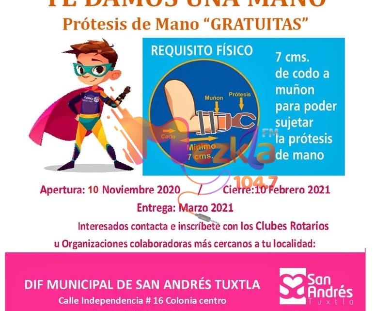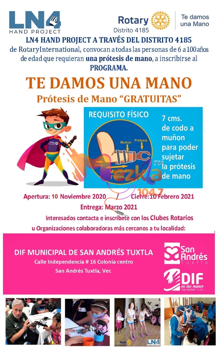 San Andrés Tuxtla, Ver.- A través del distrito 4185 de Rotary International, LN4 Hand Project invita a las personas de 6 a 100 años de edad que necesiten una prótesis de mano a inscribirse al programa: “Te damos una mano”, para ello, pueden acudir a las oficinas del DIF de San Andrés Tuxtla que encabeza la contadora pública, Lily Pérez de Pérez.