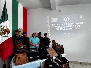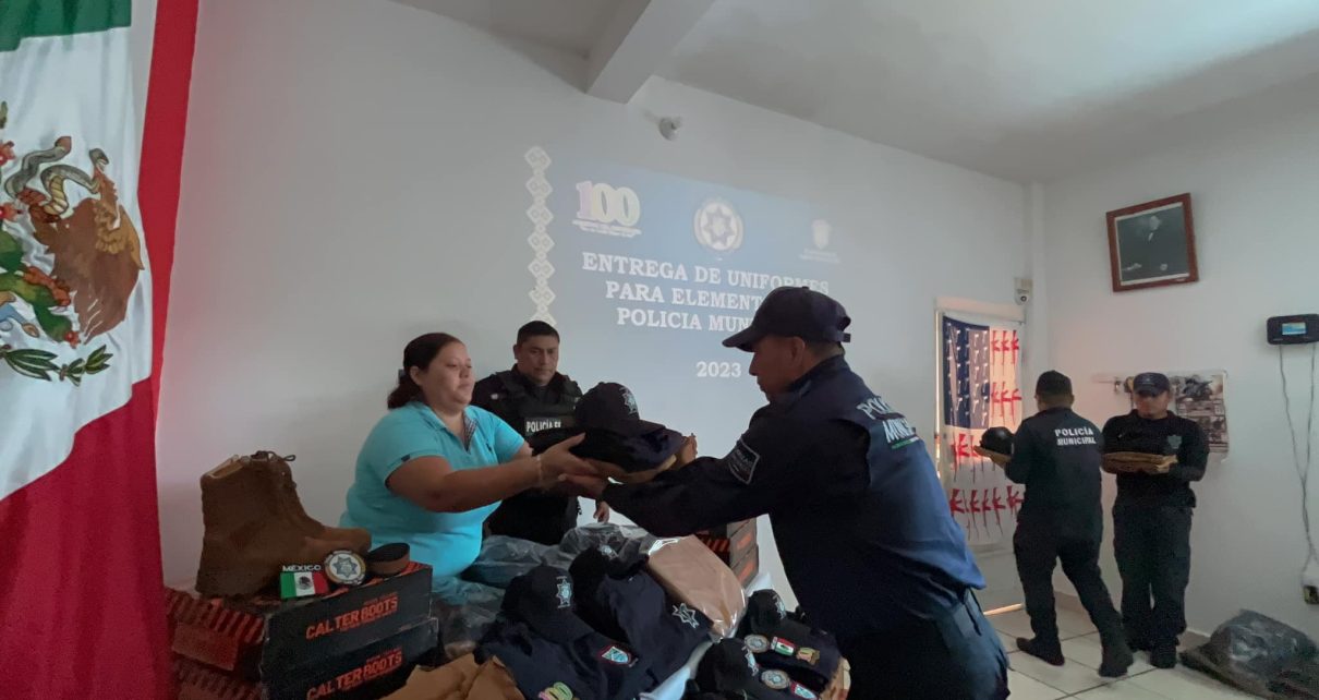 La presidenta en funciones María Esther Arróniz López hizo entrega de uniformes al cuerpo de la Policía Municipal.