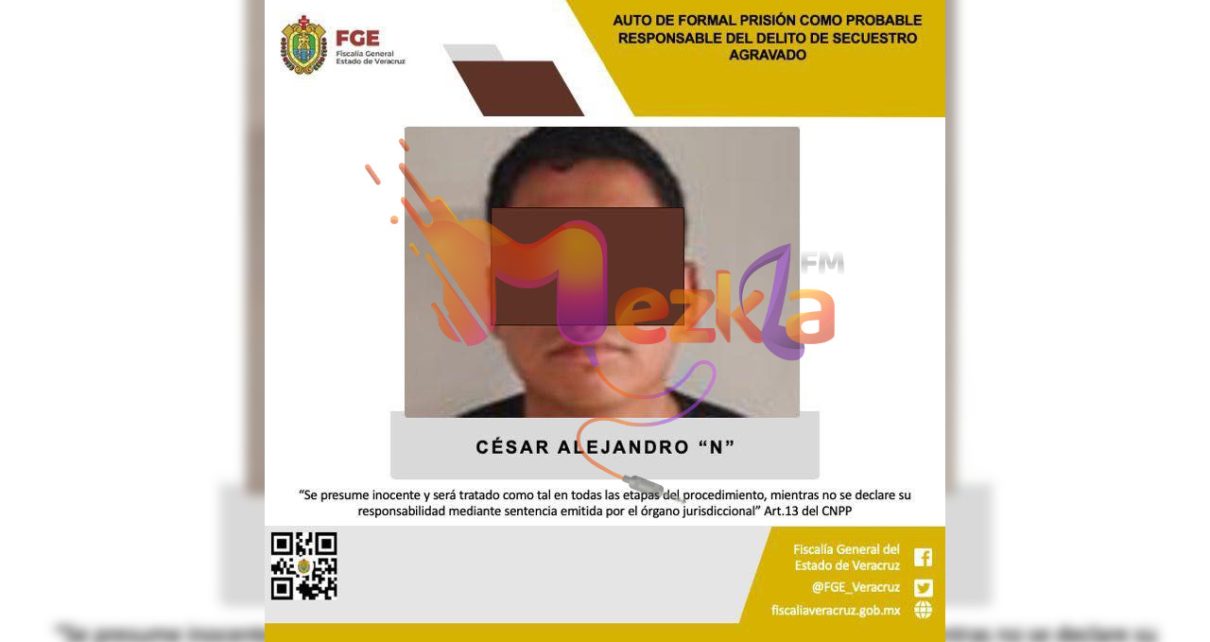 Veracruz, Ver., 5 de junio 2025.-La Fiscalía General del Estado, a través de la Unidad Especializada en Combate al Secuestro obtuvo auto de formal prisión en contra de César Alejandro “N” como probable responsable del delito de secuestro agravado, cometido en agravio de la víctima identificada con las iniciales L.G.L.D.