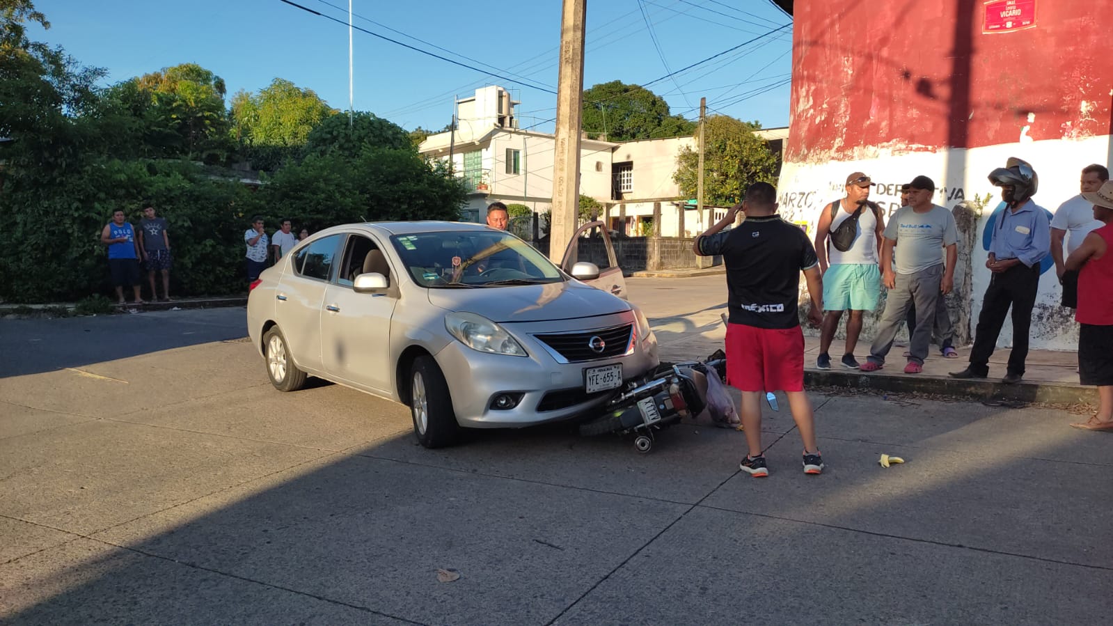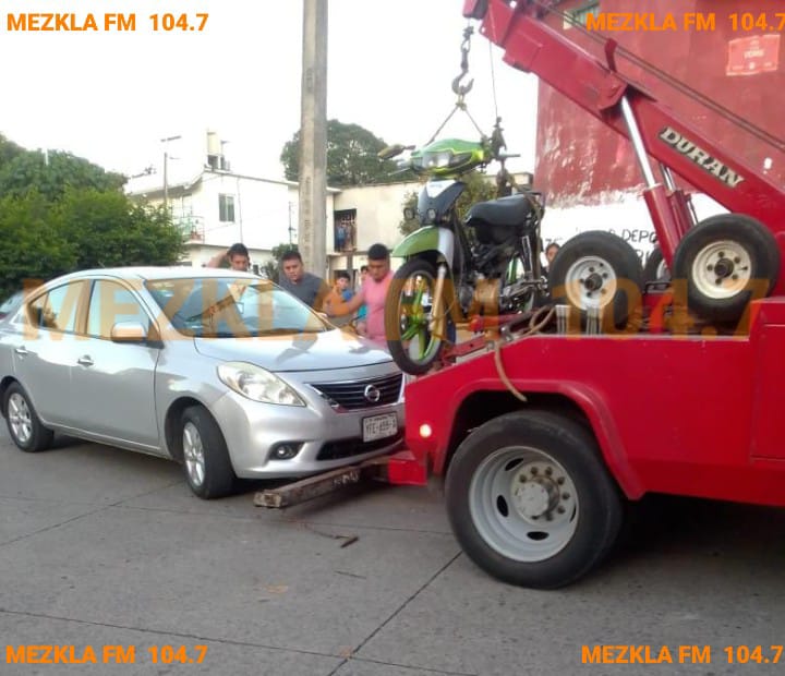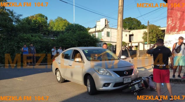 Aparatoso choque entre un auto compacto y una motocicleta en el cruce que forman las calles Leona Vicario y Plan de Ayala, justo en la esquina del campo deportivo “El Manguito” en la colonia Belén Grande.