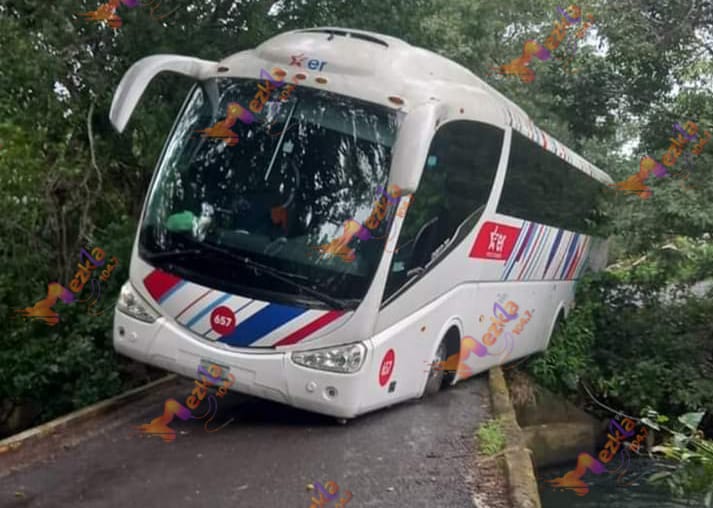Esto luego de que parte del eje del lado izquierdo de un autobús de turismo, color blanco, con vivos en rojo y azul, cayera al vacío.