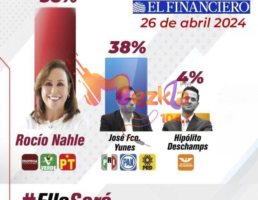 Veracruz, Ver., viernes 26 de abril de 2024.- En la carrera rumbo a la gubernatura de Veracruz, es Rocío Nahle García, candidata por Morena-PT-PVEM quien lleva la delantera, así lo indica una encuesta realizada por El Financiero que demuestra que la candidata tiene una ventaja de 20 puntos sobre el candidato por el PRI-PAN-PRD, José FranciscoYunes Zorrilla.