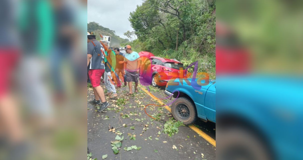 Catemaco, Ver. — Debido a las recientes lluvias que ha dejado el Frente Frío 13 por el estado de Veracruz y afectando principalmente la zona sur, en el tramo carretero federal comprendido entre las comunidades La Victoria y Zapoapan de Cabañas, un árbol cayó sobre un vehículo marca Mazda.
