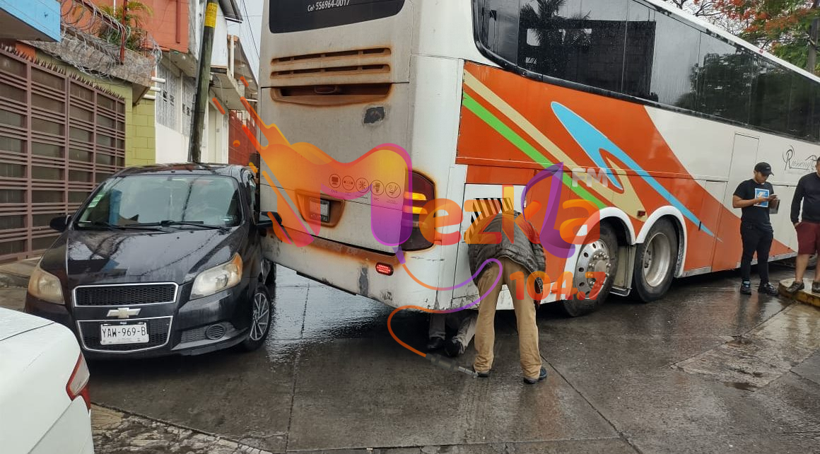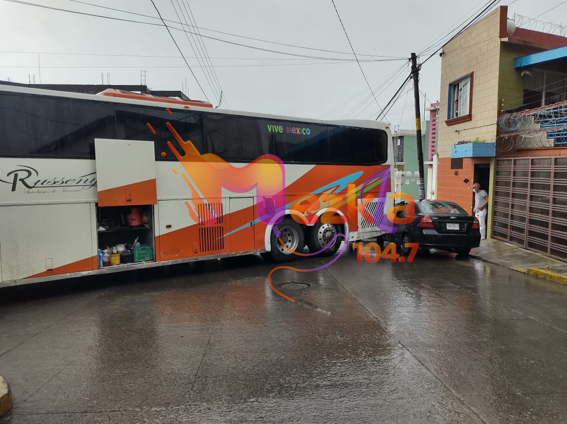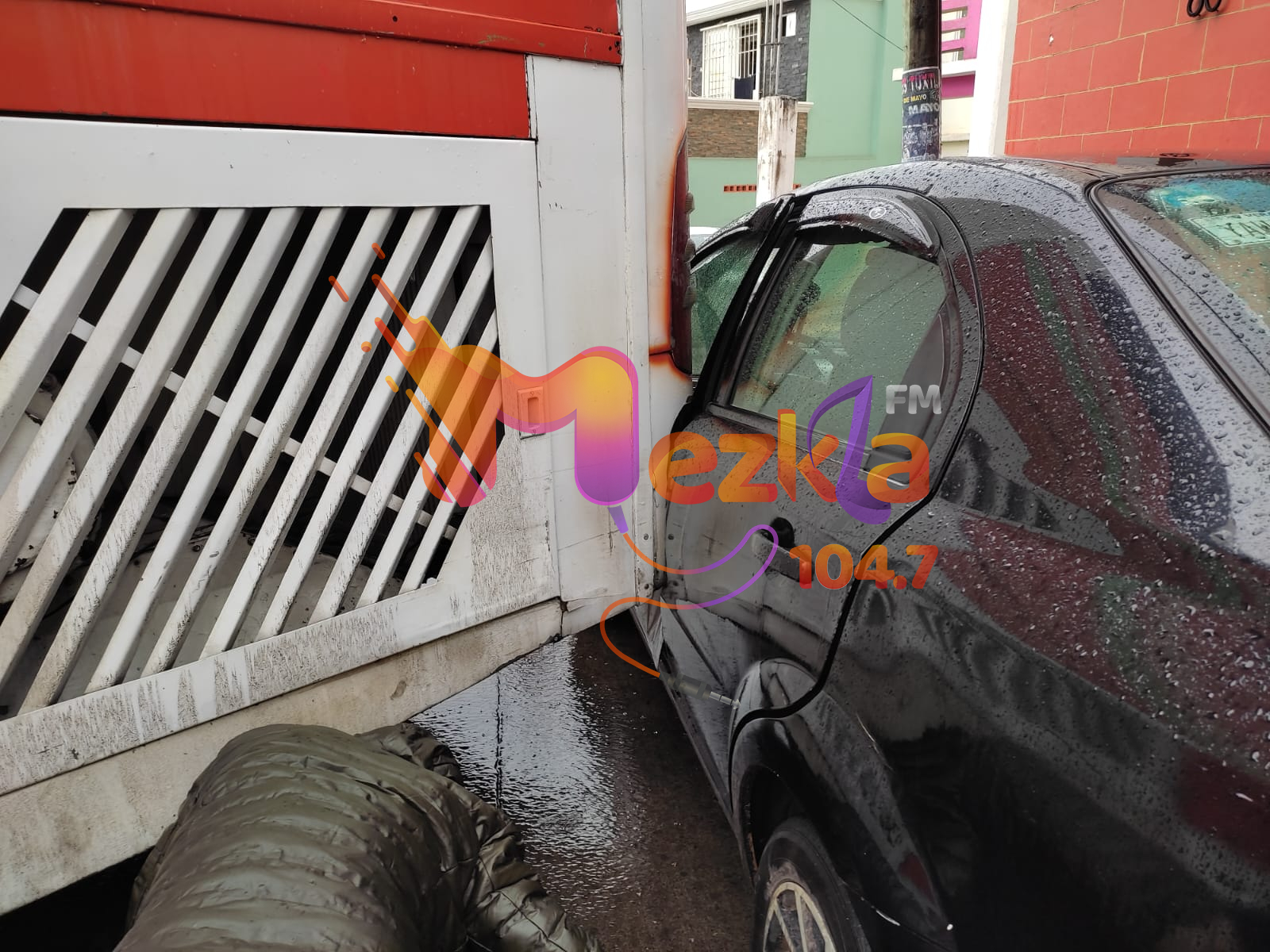 El operador del camión de transporte privado en color blanco realizaba maniobra para ingresar a la calle Ejército Nacional y en uno de los movimientos en reversa alcanzó a chocar con un auto aveo en color negro, con matrícula YAW-969-B del estado, al que le causó daños en su costado izquierdo.