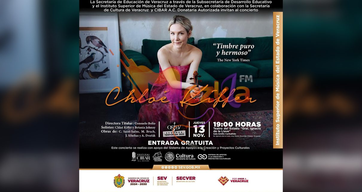 Xalapa, Ver., jueves 13 de noviembre de 2025.– La Secretaría de Educación de Veracruz (SEV) invita al concierto de la segunda temporada 2025 de la Orquesta Sinfónica Juvenil del Estado de Veracruz (OSJEV), que contará con la participación especial de la reconocida violinista internacional Chloé Kiffer, elogiada por The New York Times por su timbre puro y hermoso. El evento se realizará hoy a las 19:00 horas, en la Sala