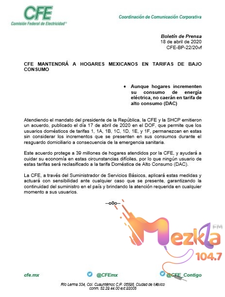 Atendiendo el mandato del presidente de la República, la CFE y la SHCP emitieron un acuerdo, publicado el día 17 de abril de 2020 en el DOF, que permite que los usuarios domésticos de tarifas 1, 1A, 1B, 1C, 1D, 1E, y 1F, permanezcan en estas sin considerar los incrementos que se presenten en sus consumos durante el resguardo domiciliario a consecuencia de la emergencia sanitaria.
