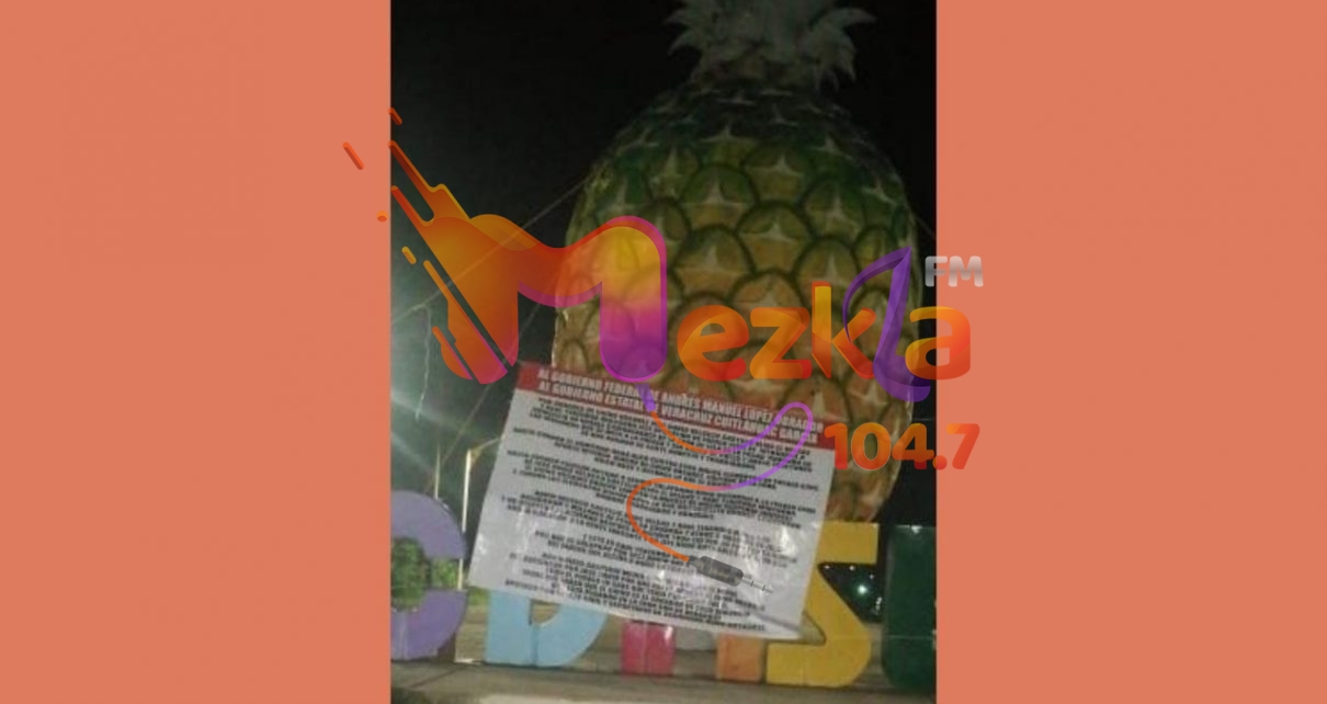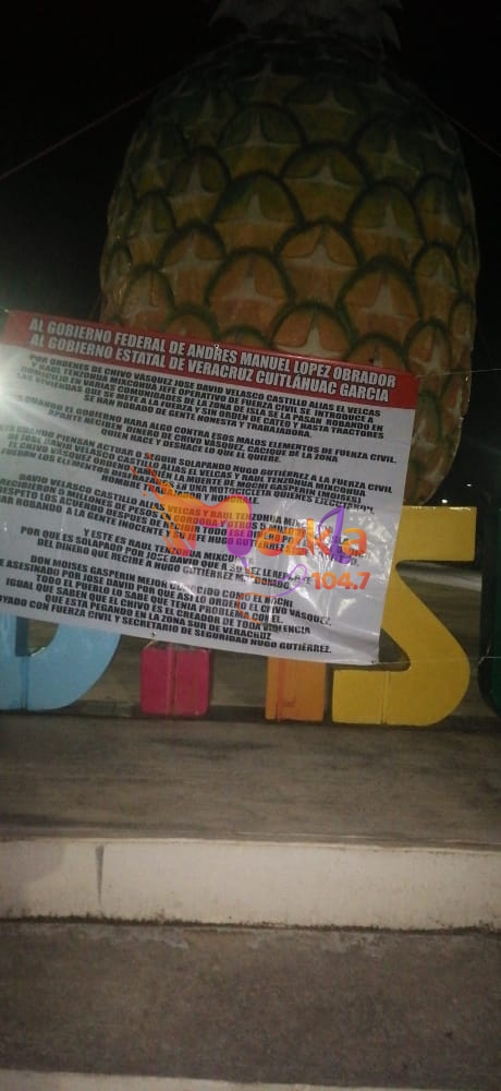 Por Sergio Herrera Montán | Ciudad isla, Ver. – Hoy por la madrugada sujetos desconocidos colgaron una narco-lona justo en la estatua de la piña que se ubica en el acceso principal del municipio piñero de Isla.