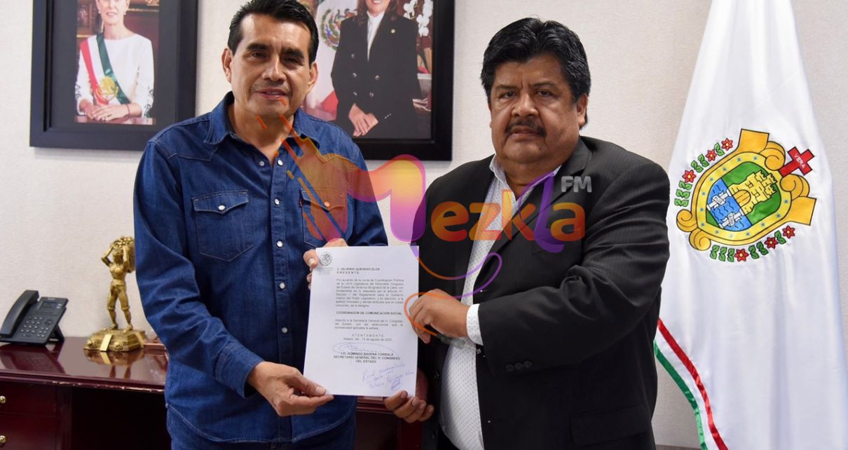 El presidente de la Junta de Coordinación Política (Jucopo) de la LXVII Legislatura, diputado Esteban Bautista Hernández, entregó al comunicador Silverio Quevedo Elox el nombramiento que lo acredita como titular de la Coordinación de Comunicación Social del Congreso del Estado de Veracruz.