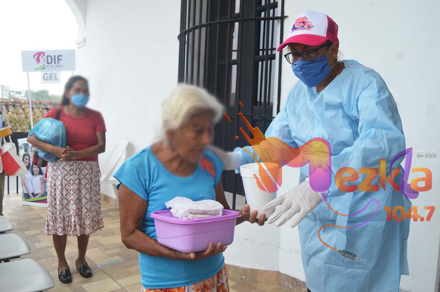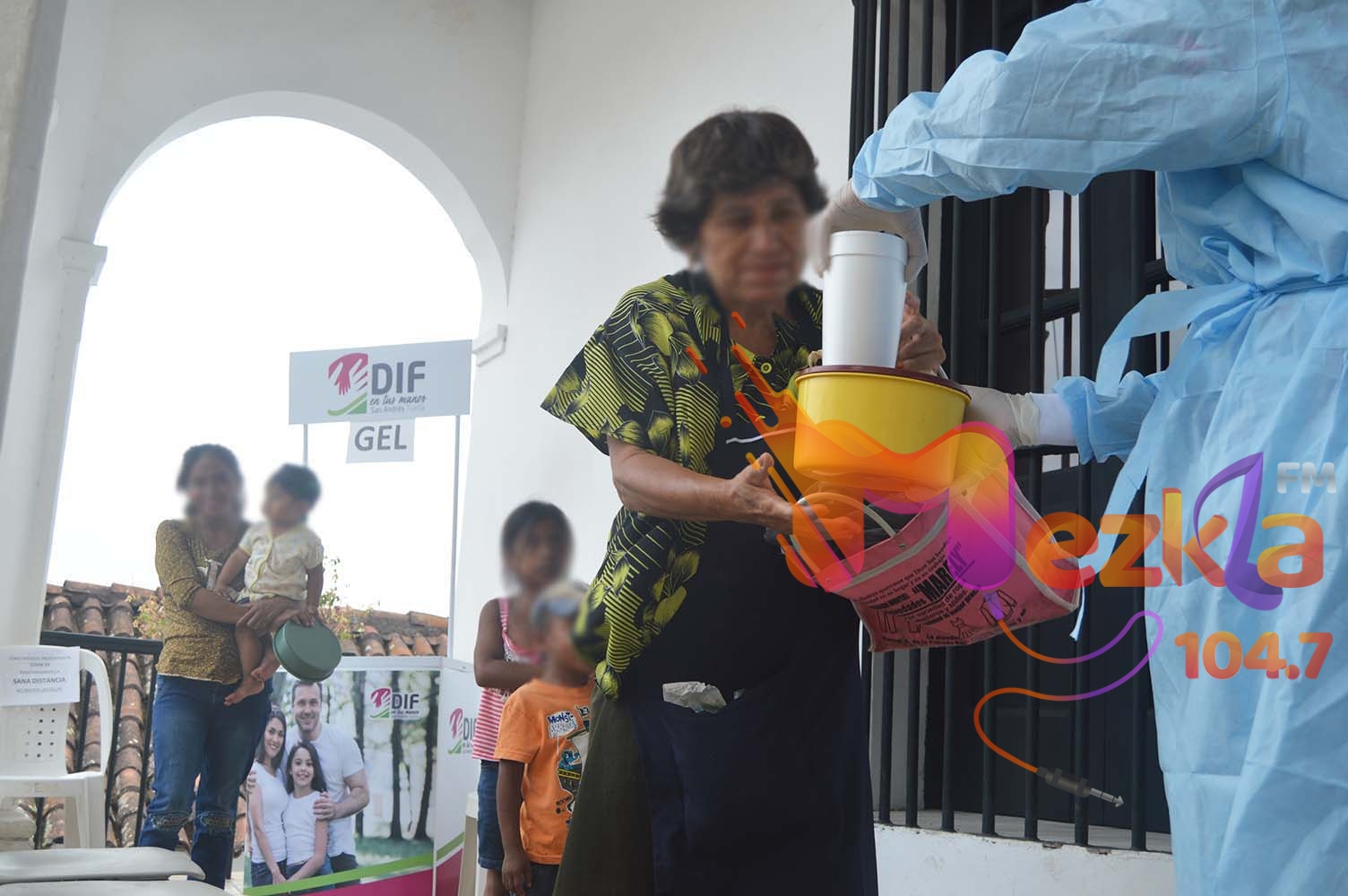 Cientos de sanandresinos han acudido puntualmente a las instalaciones del DIF, ubicado en calle Independencia número 16, en donde personal de la misma, se encarga de implementar los protocolos correspondientes, como: la sana distancia, uso de cubrebocas y la aplicación de gel antibacterial, para atender adecuadamente a quienes acuden a solicitar los apoyos alimentarios.