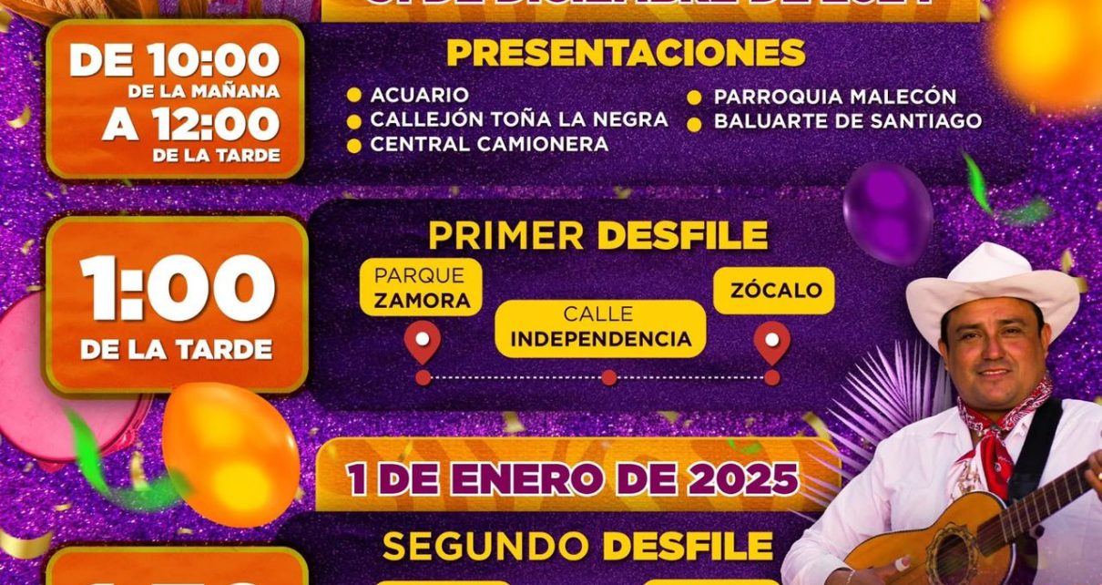 A las 13:00 horas iniciará el gran Primer Desfile desde el Parque Zamora, recorrerá la avenida Independencia y culminará en el Zócalo, con la participarán de más de 245 bastoneras, batucadas, carros alegóricos, comparsas, mojigangas, bailarines y una grúa alusiva al Año Viejo.