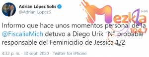 En Twitter, el funcionario estatal explicó que se realizan los trámites para presentar al implicado ante el juez de control que lo reclama. “Informo que hace unos momentos personal de la @FiscaliaMich detuvo a Diego Urik “N” probable responsable del Feminicidio de Jessica”,