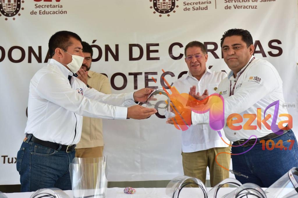 Acompañado de autoridades educativas, el servidor público otorgó también 300 mascarillas a la Jurisdicción de Tuxpan, 300 a la de Poza Rica y 200 en la de Coatzacoalcos; mientras que los hospitales públicos, en Tuxpan, recibirán cabinas de desinfección para uso exclusivo de personal médico y de enfermería.