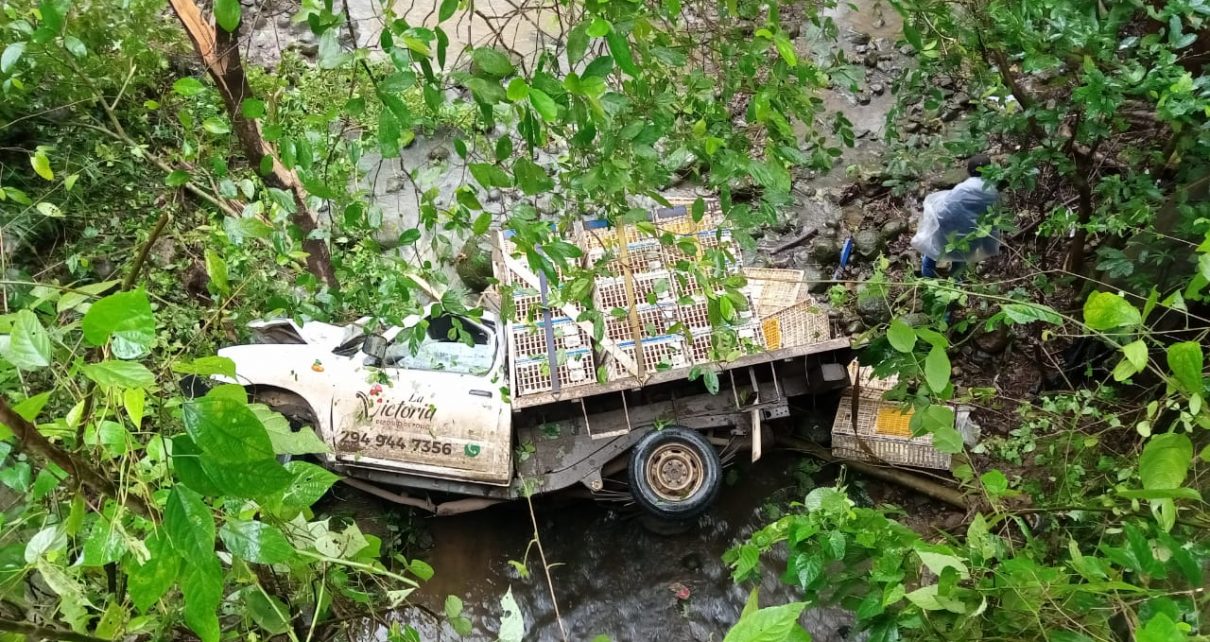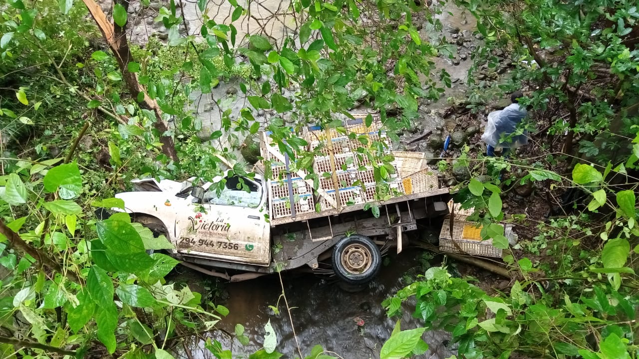 Sitio donde se registró la salida y volcadura de una camioneta Nissan, color blanco, con plataforma y razón social “La Victoria” dedicado a la venta y reparto de pollos, dicha empresa está asentada en la localidad La Victoria perteneciente a Catemaco.