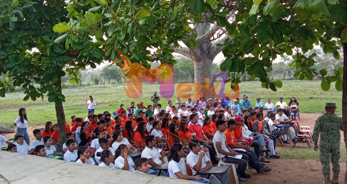 Santiago Tuxtla.- Personal de la Secretaría de la Defensa Nacional, Guardia Nacional, C4 en coordinación con el Ayuntamiento de Santiago Tuxtla a través de la Dirección de Seguridad Pública Municipal, llevaron a cabo una plática sobre el consumo de sustancias tóxicas y el uso correcto de la línea de emergencia 911, con alumnos, padres de familia, maestros y directivos de la escuela telesecundaria “Belisario Domínguez” de la localidad de Tinernal, asimismo estuvieron presentes Agentes Municipales de las comunidades vecinas.
