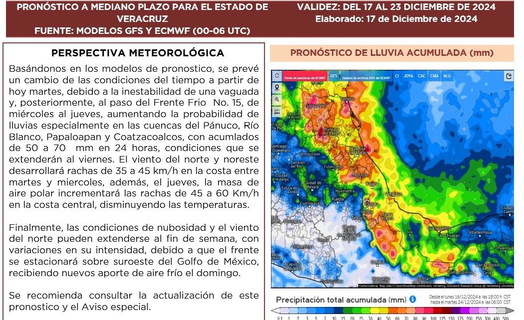 Estamos dentro de la temporada de frentes fríos y Nortes, para esta temporada que inició la segunda quincena de septiembre de 2024 y concluye en la primera quincena de mayo de 2025, el Servicio Meteorológico Nacional pronosticó la llegada de 48 frentes fríos al territorio nacional, dos menos que la media. En promedio dentro de la temporada 30 frentes cruzan por el estado de Veracruz. Hasta esta fecha han arribado al país 15 frentes fríos, de ellos cinco han cruzado por nuestra entidad. Esta semana se espera el arribo y paso por Veracruz del frente número 15.