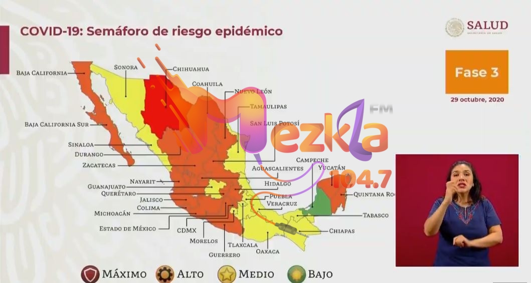 Mientras que en amarillo se encuentran los estados de Sonora, Sinaloa, Guanajuato, Morelos, Tlaxcala, Puebla, Tamaulipas, Veracruz, Oaxaca, Chiapas y Tabasco. Y en naranja están Baja California Sur, Baja California. Coahuila, Nuevo León, Nayarit, Zacatecas, Durango, Aguascalientes, San Luis Potosí, Jalisco, Colima, Michoacán, Hidalgo, Estado de México, Ciudad de México, Querétaro, Guerrero, Yucatán y Quintana Roo.