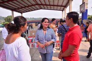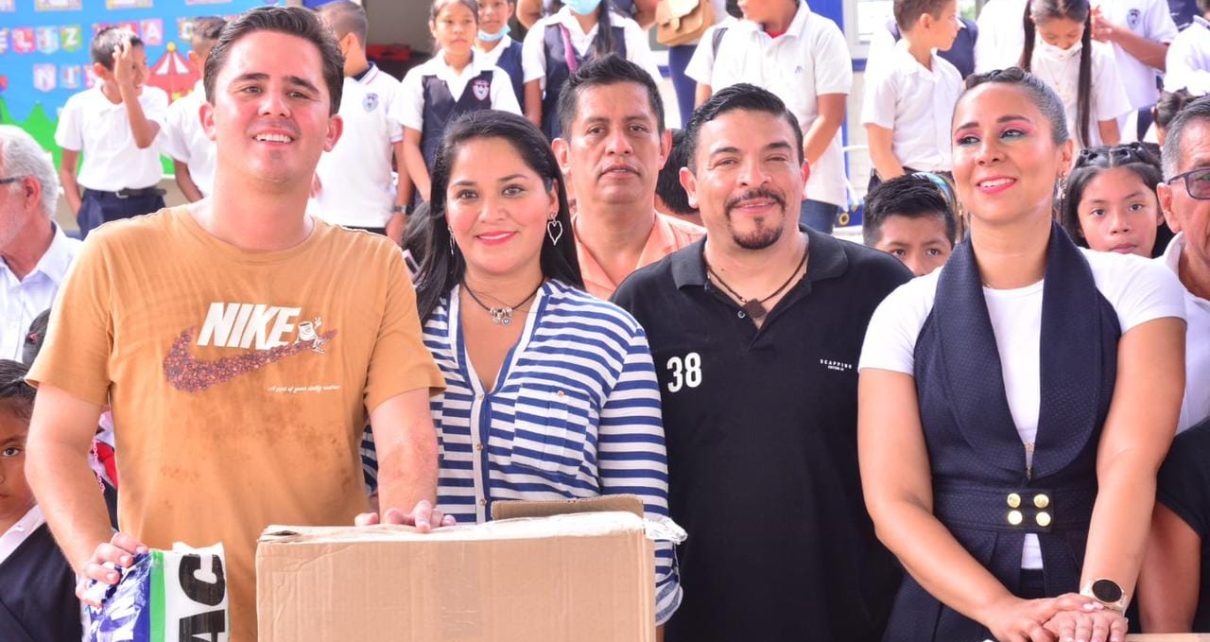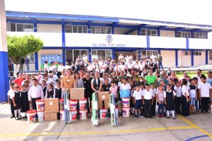 Kristel Hernández Topete, alcaldesa de Santiago Tuxtla, agradeció a la Oficial Mayor de la Secretaría de Educación de Veracruz, Dra. Ary Aguilar Amaya, por la invitación a la entrega de material escolar a los directores de la Escuela Primaria “Juana Bernal de Carvajal”, Prof. Roberto Rodríguez Ríos del turno Matutino y el Prof. Venancio Azamar Mendoza del turno Vespertino, con el cual podrán mejorar las instalaciones del plantel educativo.