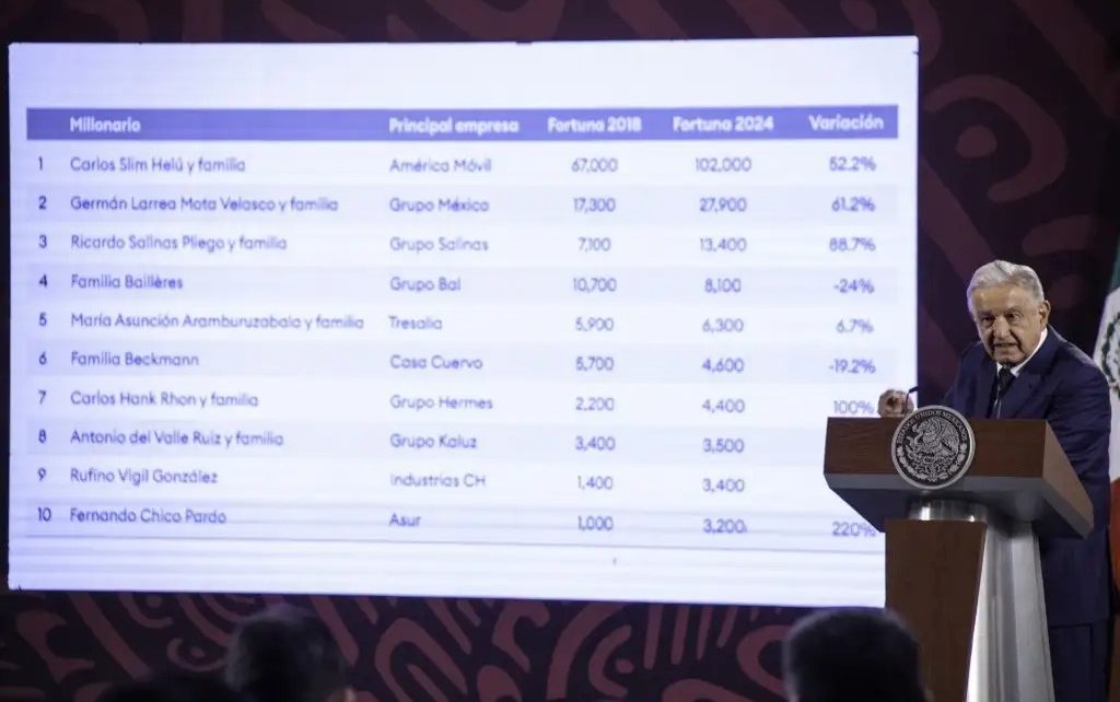 Con base en el listado de la revista Forbes, sobre los más acaudalados de México, el mandatario federal hizo ese exhorto a Carlos Slim, Germán Larrea, Ricardo Salinas Pliego, a la familia Bailléres y María Asunción Aramburuzabala manifestar, por cualquier medio, su posición al respecto.