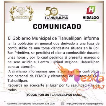El H Ayuntamiento de Tlahuelilpan, Hidalgo, confirma la fuga de combustible a causa de huachicoleros en San Primitivo, cerca donde se suscitó la explosión que costó 135 de vidas en 2019.