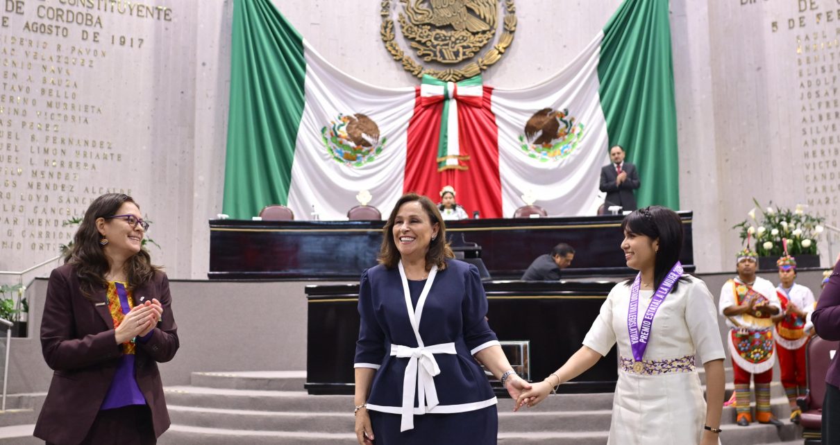 Xalapa, Ver., jueves 06 de marzo de 2025.- En sesión solemne del Congreso del Estado, la gobernadora Rocío Nahle García entregó el Premio Estatal a la Mujer a Ángela Elena Olazarán Laureano, joven originaria de Papantla, quien en 2024 fue reconocida con el Global Student Prize como la mejor estudiante del mundo.