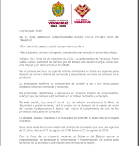 Xalapa, Ver., lunes 02 de diciembre de 2024.- La gobernadora de Veracruz, Rocío Nahle García presidió la primera Mesa de Seguridad de su administración, desde su tierra, Coatzacoalcos, donde reafirmó el compromiso con la seguridad y el bienestar de las y los veracruzanos.