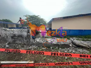 La mandataria municipal, María Esther Arróniz López arrancó la obra que beneficiará a 210 niños en total y que garantizará su integridad física en los límites de dicha barda toda vez que representaba un peligro inminente para los niños pues estaba a punto de colapsarse.