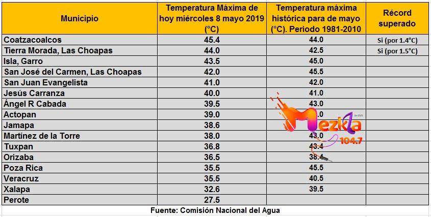 En Coatzacoalcos y Las Choapas, se superó el registro histórico para un mes de mayo Coatzacoalcos: Máxima de hoy 45.4°C (récord anterior 44.0) Tierra Morada, Las Choapas Máxima de hoy 44.0°C (récord anterior 42.5).