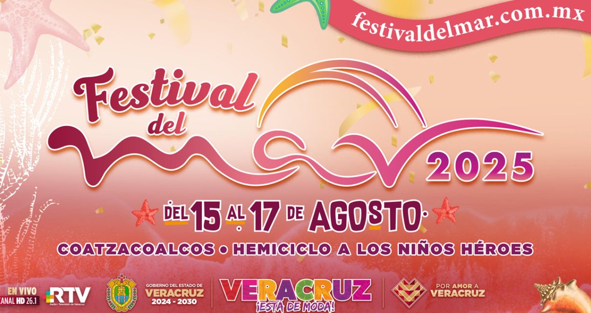 Xalapa, Ver., domingo 27 de julio de 2025.- El Gobierno del estado de Veracruz celebrará del 15 al 17 de agosto el Festival del Mar en Coatzacoalcos, evento que integra reflexión, cultura y música con la participación de reconocidas figuras del arte nacional e internacional.