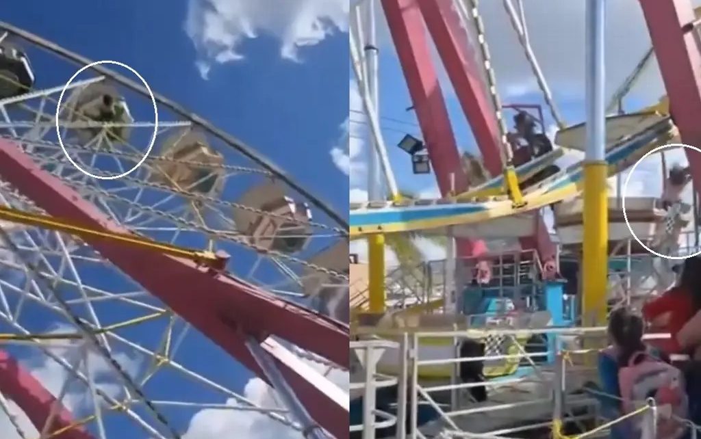 En redes sociales circula un video que muestra el momento en que una mujer cae desde lo alto del juego mecánico conocido como “rueda de la fortuna”, en las instalaciones de la Feria Nacional Potosina.