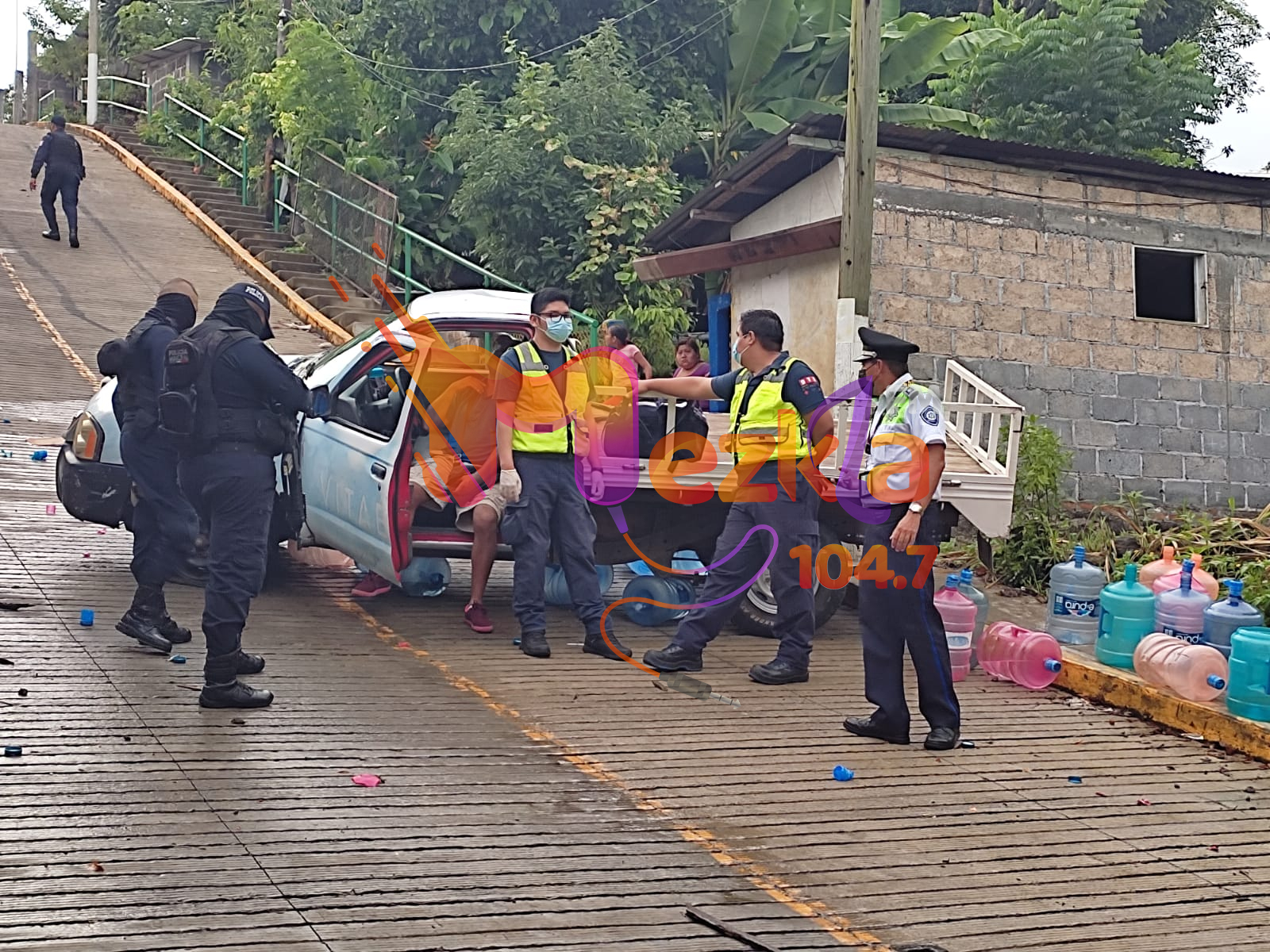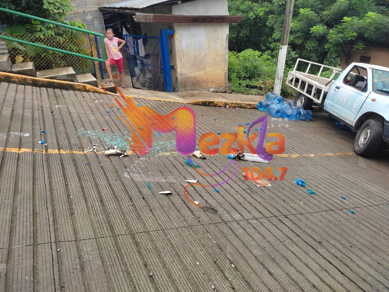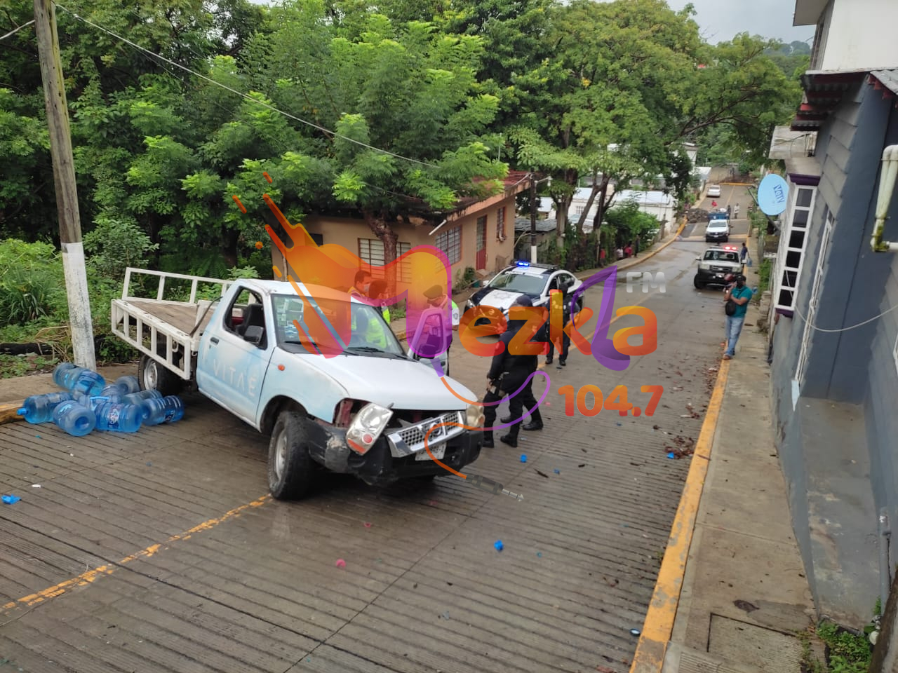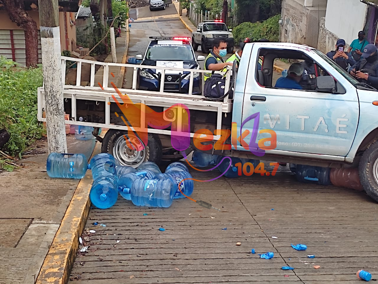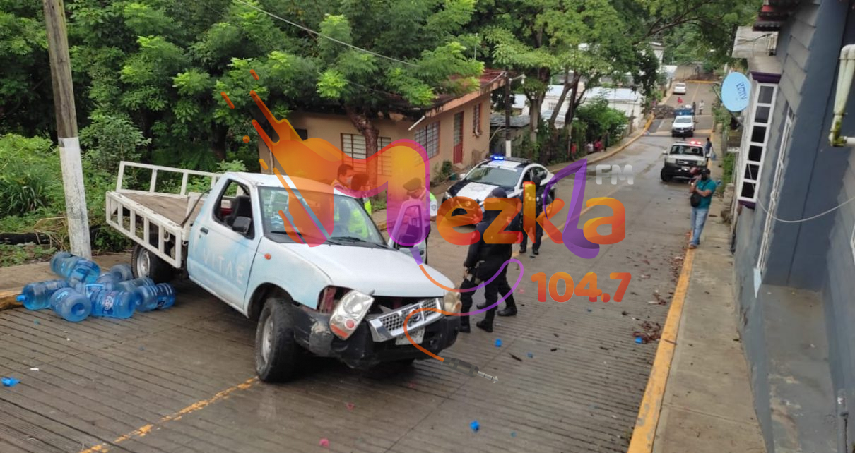 Esto ocasionó que el vehículo sufriera daños principalmente en su parte frontal, mientras que los garrafones que transportaba quedaron esparcidos.