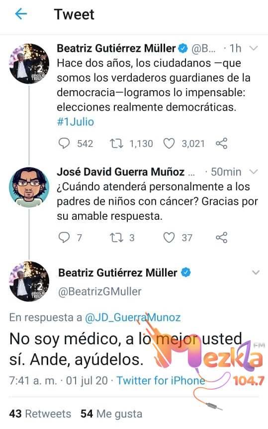 Gutiérrez Müller aprovechó este 1 de julio para compartir un tuit donde celebraba el triunfo electoral de hace dos años del actual Mandatario, sin embargo, en una de las respuestas un usuario la cuestionó sobre cuándo atenderían personalmente a los padres de niños con cáncer.