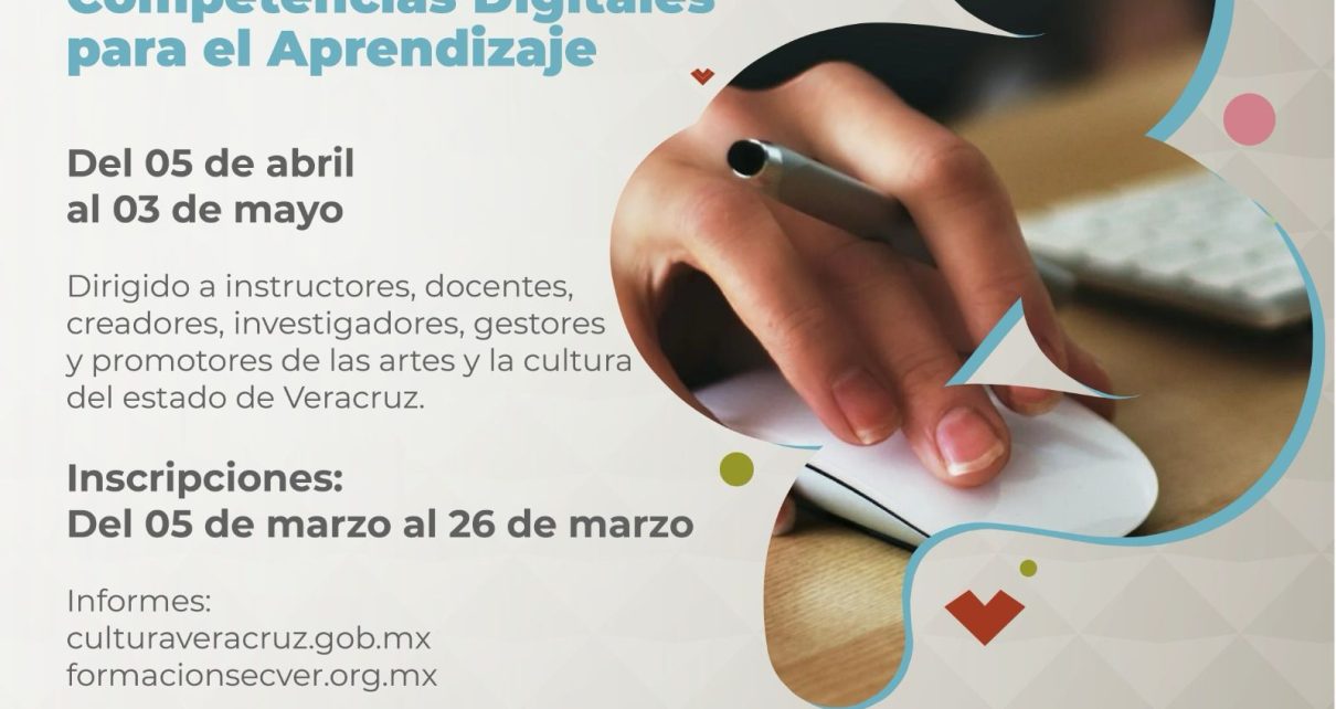 Xalapa, Ver., jueves 06 de marzo de 2025.- La Secretaría de Cultura (SECVER) invita a gestores, promotores, directivos, creadores, docentes e investigadores del ámbito cultural y artístico a participar en el curso Competencias Digitales para el Aprendizaje, del 5 de abril al 3 de mayo.