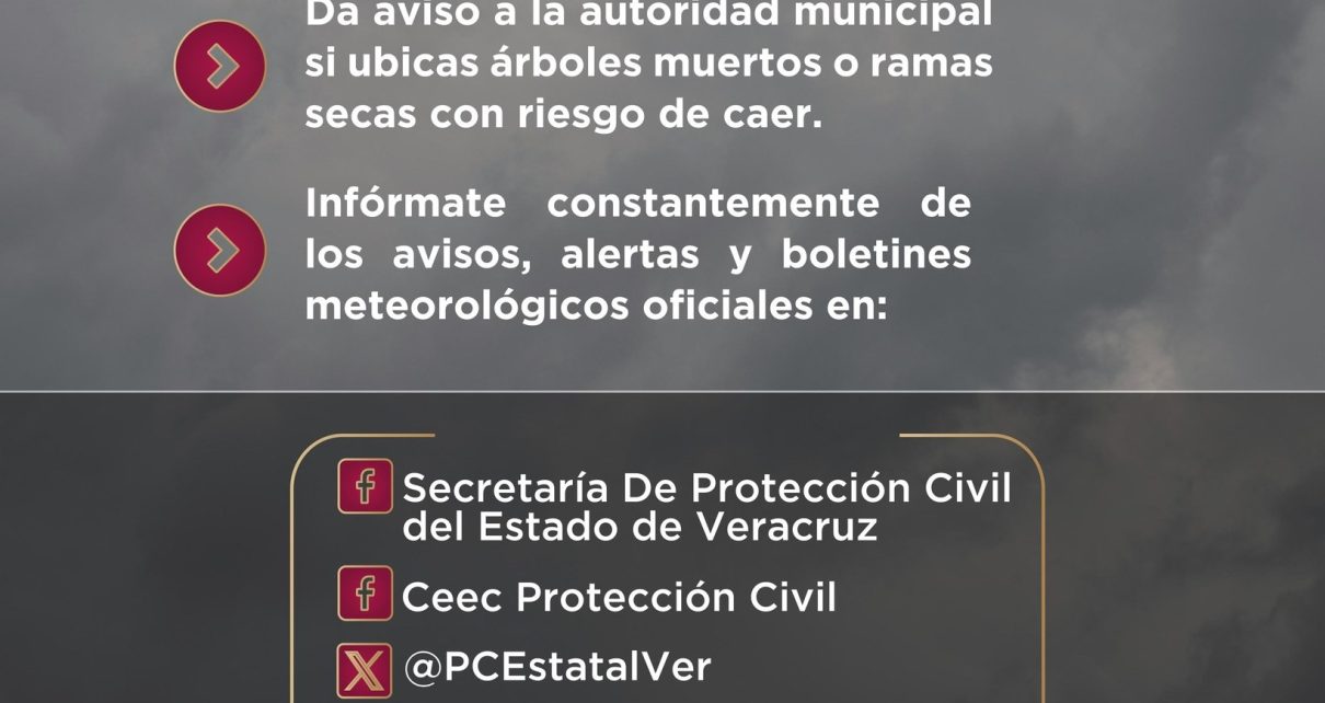 Ante ello, PC reitera a la población tomar algunas precauciones para asegurar techos de teja o lámina así como objetos que puedan caer o volarse, no realizar actividades de navegación, evitar el uso del fuego ya que el viento puede propagar incendios, y reportar al municipio árboles, postes o estructuras que pudieran caer.