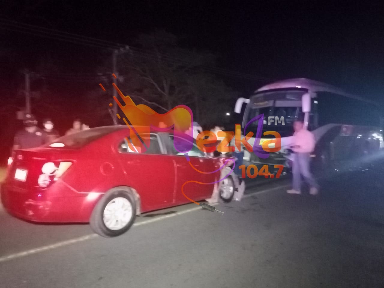 Se trató de un choque frontal entre un auto Sonic, color rojo, con matrícula DRF-535-A del estado de Chiapas y un autobús de la línea AU, marcado con el número económico 4902.