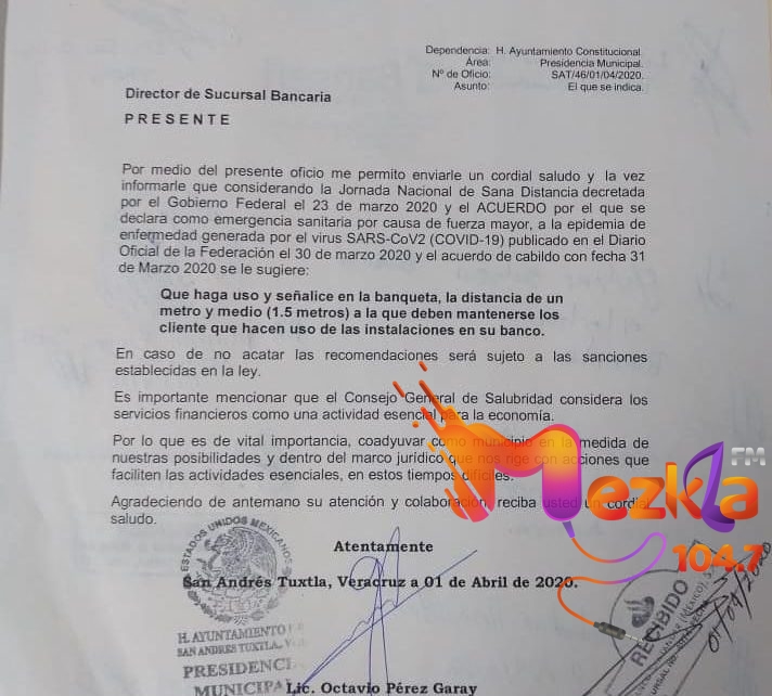 “En el oficio donde hacemos la observación a los bancos, les recordamos que de acuerdo a lo dispuesto en la Jornada Nacional de Sana Distancia, decretada por el gobierno federal el pasado 23 de marzo, se acuerda que ante la emergencia sanitaria, aquellos comercios o instituciones que hagan uso de filas para prestar su servicio, deberán señalizar la distancia adecuada y en el caso de los bancos que hacen uso de banquetas, deberán marcar y hacer respetar la distancia de metro y medio entre cada cliente que haga fila para hacer uso de las instalaciones de su banco”, comentó Tavo Pérez.