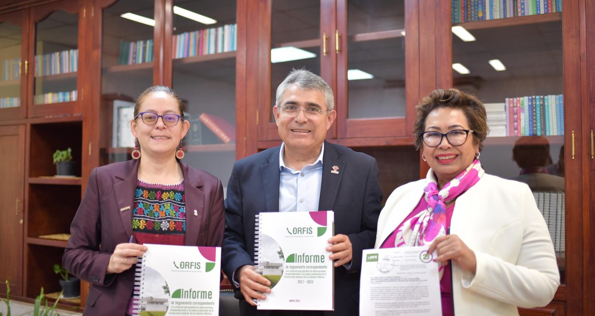 Con la presencia de la presidenta de la Mesa Directiva, diputada Tanya Carola Viveros Cházaro, y del presidente de la Junta de Coordinación Política (Jucopo), diputado Esteban Bautista Hernández, el presidente de la Comisión Permanente de Vigilancia, diputado Miguel Guillermo Pintos Guillén, recibió de la titular del Órgano de Fiscalización Superior del estado (Orfis), Delia González Cobos, el informe de seguimiento correspondiente a la situación que guardan las observaciones, recomendaciones y acciones promovidas de la fiscalización superior de las Cuentas Públicas 2017 a 2023.