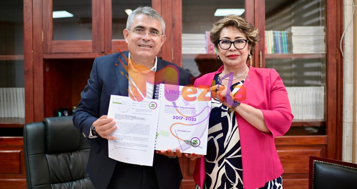 Xalapa, Ver., 05 de septiembre de 2025.- La Comisión Permanente de Vigilancia, por conducto de su presidente, diputado Miguel Guillermo Pintos Guillén, recibió de la titular del Órgano de Fiscalización Superior del estado (Orfis), auditora Delia González Cobos, el Informe de Seguimiento de las Cuentas Públicas 2017-2023, dando así cumplimiento a lo dispuesto en el Artículo 61 de la Ley de Fiscalización Superior y Rendición de Cuentas de Veracruz.