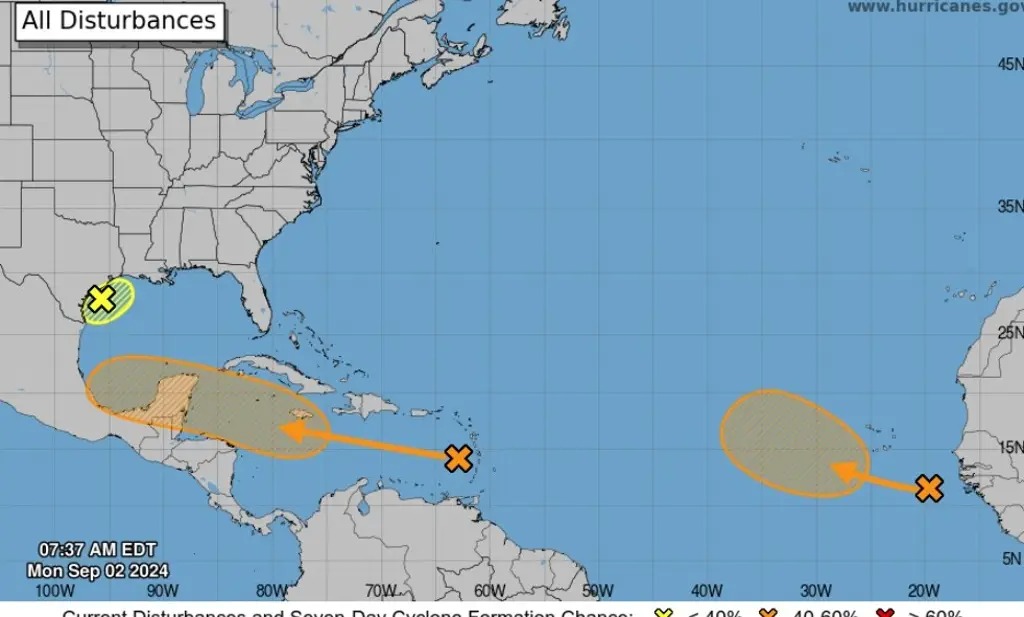 Destaca que se mantienen en vigilancia las tres ondas tropicales entre el Caribe y la costa de África y se vigila una baja presión en el noroeste del Golfo de México.