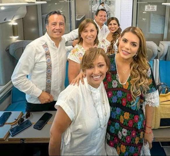 Cancún, Quintana Roo, viernes 20 de septiembre de 2024.- La gobernadora electa de Veracruz, Rocío Nahle García, acompañó al presidente Andrés Manuel López Obrador y a la presidenta electa, Claudia Sheinbaum Pardo, a la puesta en marcha de la ruta Cancún-Chichén Itzá-Teya del Tren Maya inaugurada hoy.
