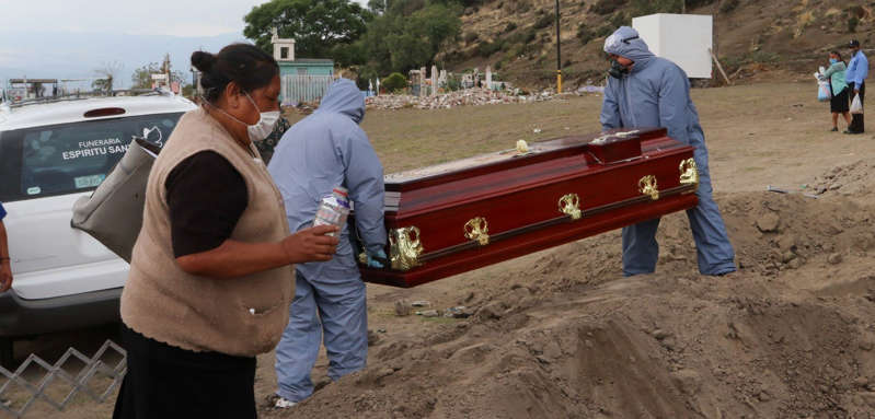 Imagen: Agencia Cuartoscuro Dos trabajadores de funeraria cargaron un ataúd ce una muerte probable de Covid-19 en el Panteón Municipal Xico