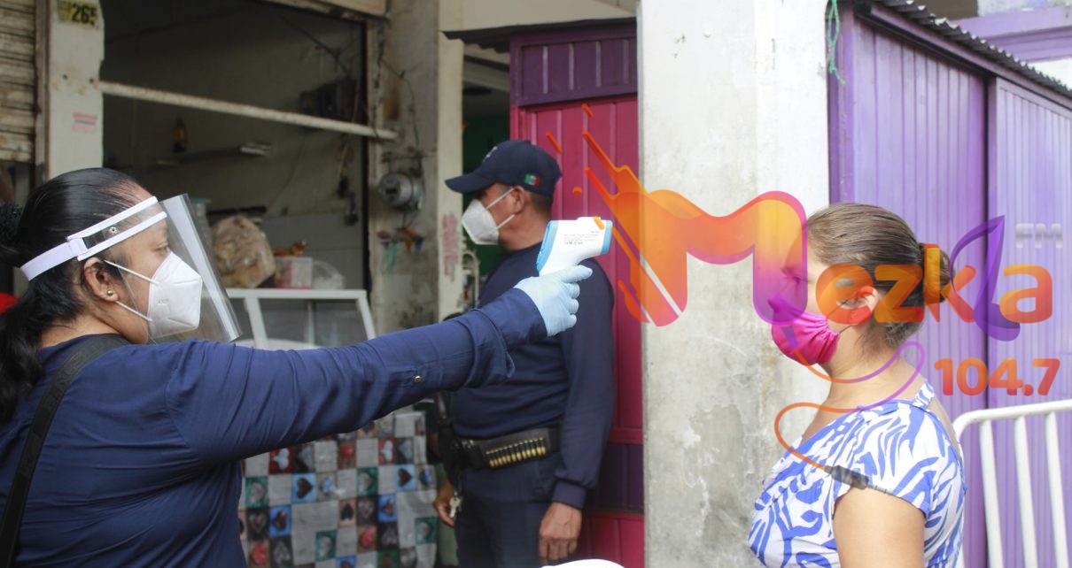 – Personal del ayuntamiento que preside el Lic. Argeniz Vázquez Copete aplica gel antibacterial y mide la temperatura a los ciudadanos y locatarios.