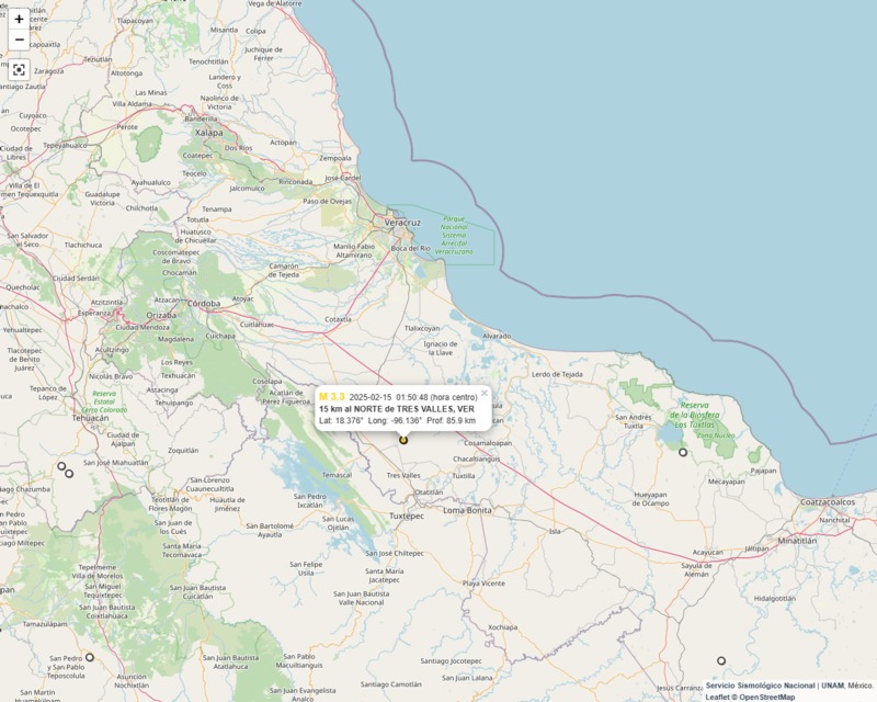 Su epicentro se localizó a 15 kilómetros al norte de Tres Valles, con una profundidad de 85.9 kilómetros.