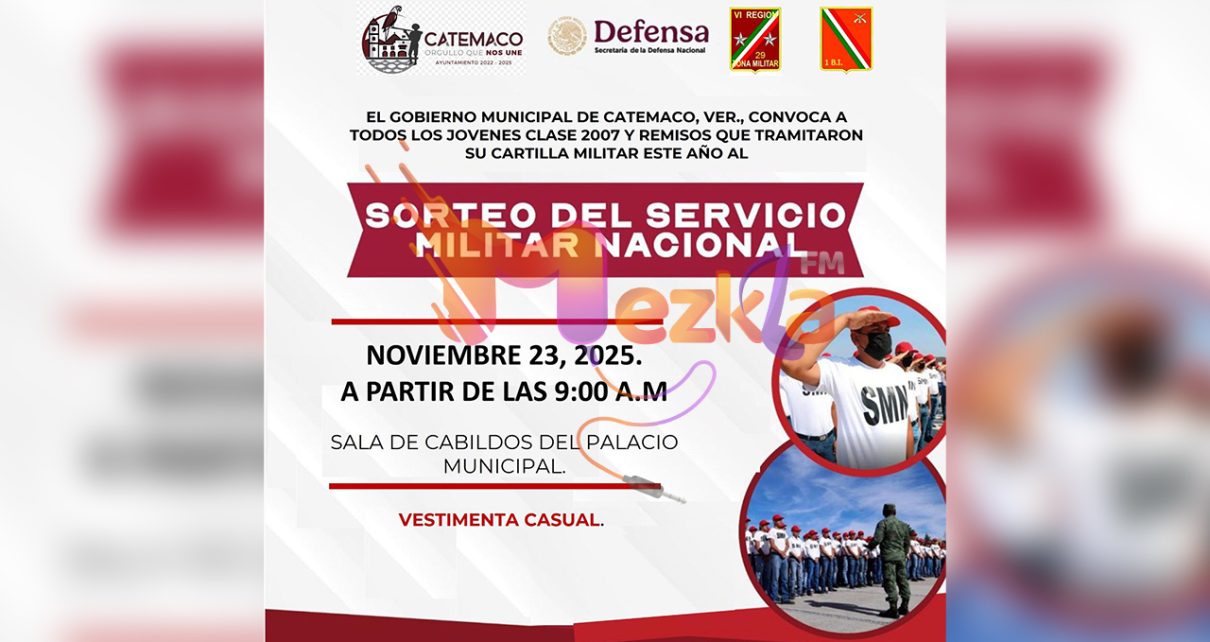 El H. Ayuntamiento de Catemaco, en coordinación con la Secretaría de la Defensa Nacional, invita al Sorteo del Servicio Militar Nacional 2025, que se llevará a cabo el sábado 23 de noviembre, a partir de las 9:00 a.m. en la Sala de Cabildos del Palacio Municipal.