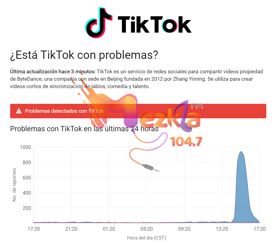 De acuerdo con Downdetector, TikTok experimentó fallas desde aproximadamente las 15:00 horas (tiempo de México) de este lunes. Los principales problemas reportados a través del sitio, fueron problemas para cargar el servidor, reproducir los videos e iniciar sesión.