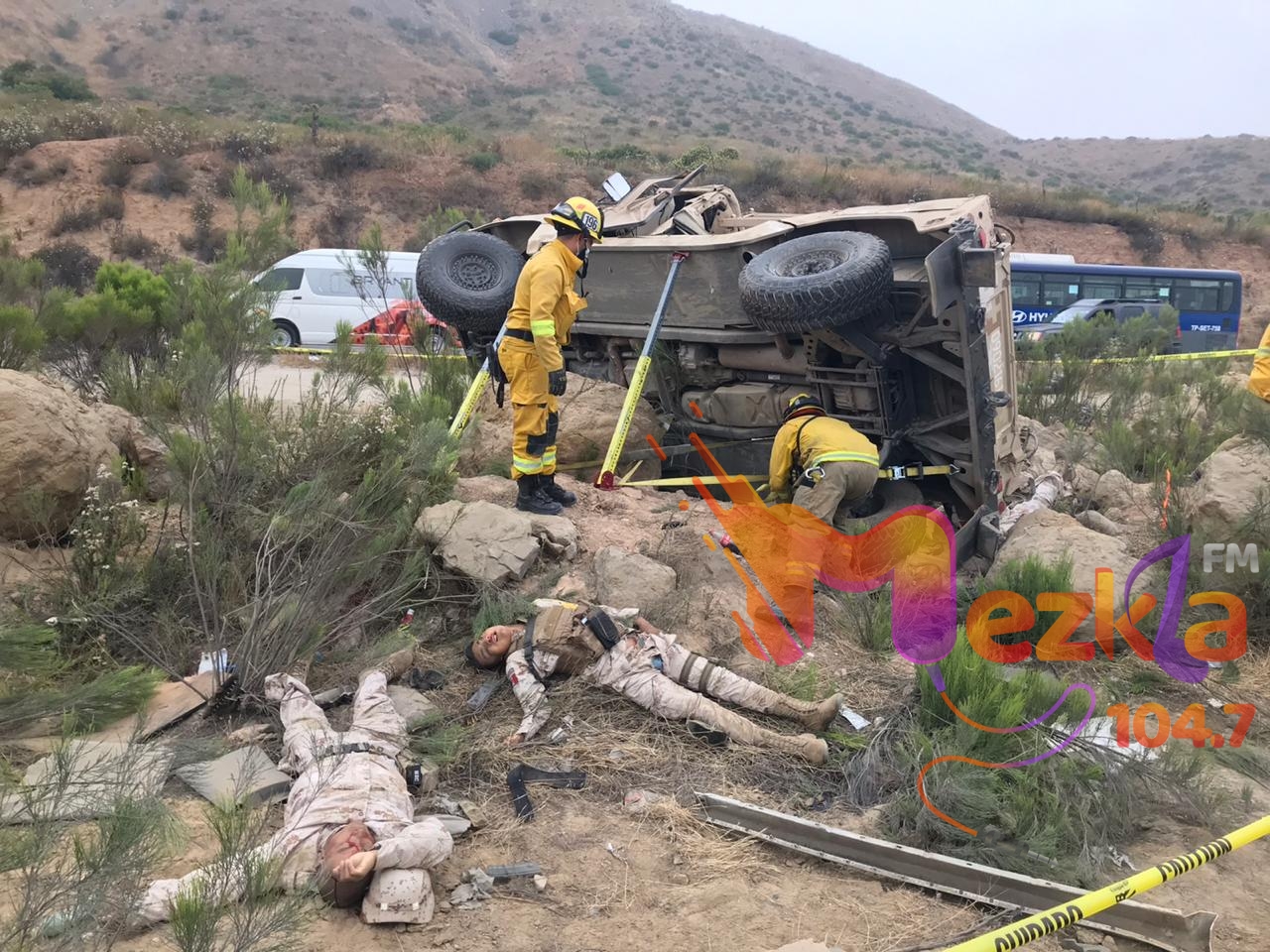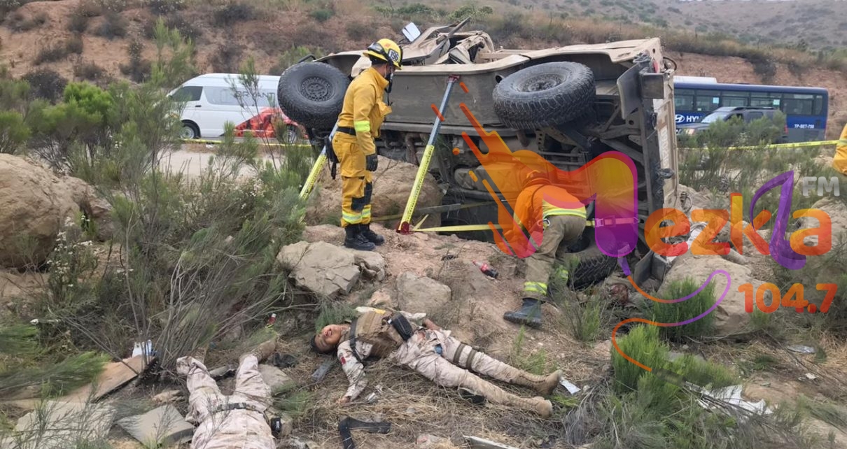 Tijuana.- Aparatoso accidente de un vehículo de la Secretaría de la Defensa Nacional (SEDENA) sobre la carretera en Tijuana- Rosarito en el kilómetro 30 altura Rancho Casian Blvd 2000, dejo como saldo 6 militares muertos y 4 heridos al parecer son pertenecientes al segundo Regimiento de Caballería Motorizada.