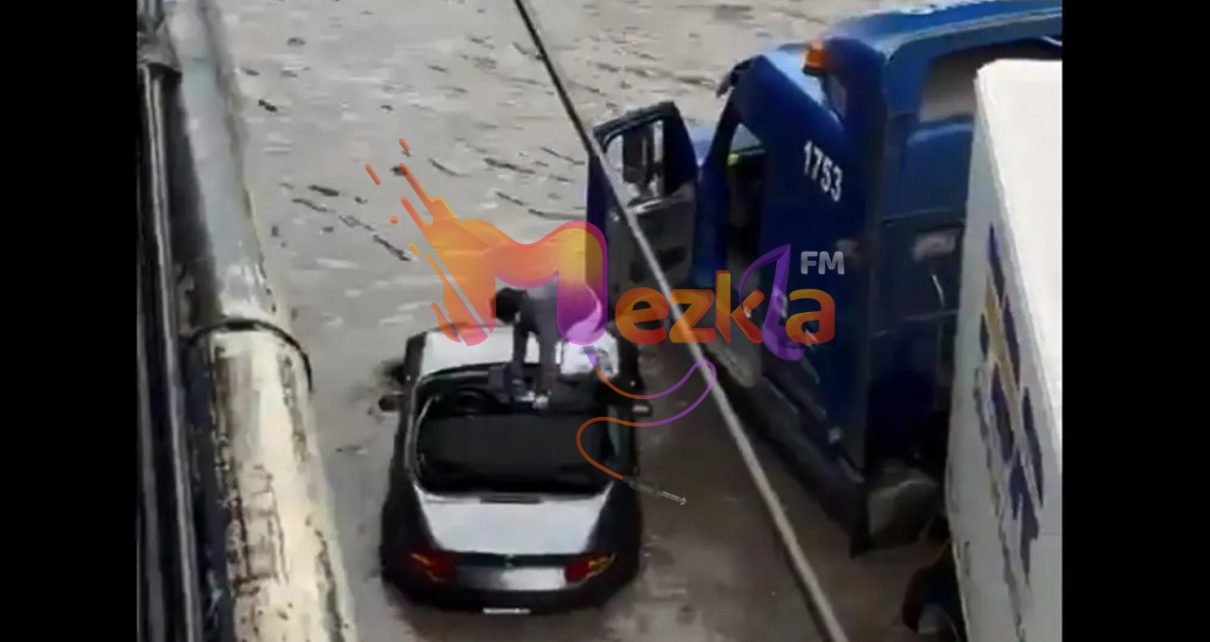 Fue captado en video el momento exacto en que un trailero rescata al conductor de un automóvil deportivo, el cual quedó atrapado en medio de una inundación registrada en el Estado de México.
