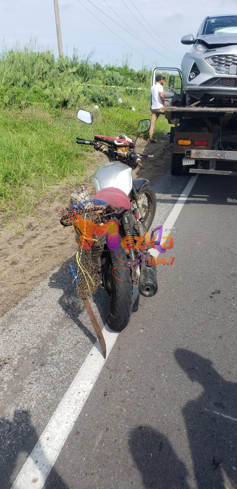 Se trató de un choque entre un auto Seat, color negro, con matrícula del estado que era conducido por una dama originaria de Tlacotalpan y una motocicleta color blanco, sin placas de circulación, que fue abandonada a escasos metros del accidente.